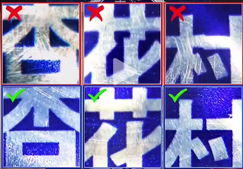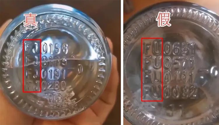 真:红盖和黄盖,都有两排数字,数字下方有一个“汾”字,都是激光刻印,不轻易被擦除,摸起来有明显凹凸感。“汾”字上半部分在瓶盖上,下半部分在瓶身上,上下吻合无错位,而且“氵”带有弧度。