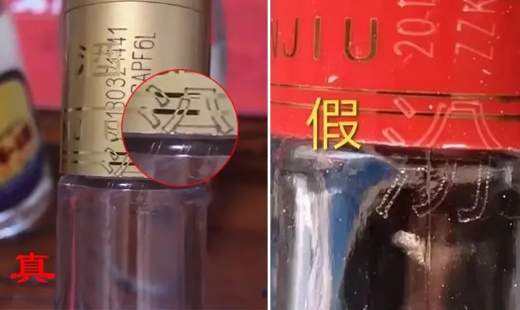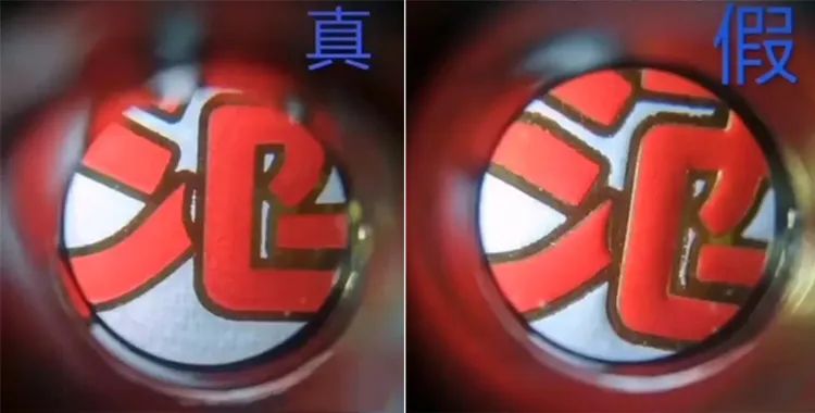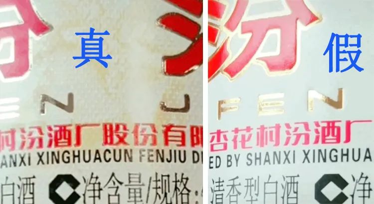 假:做工明显粗糙很多,“氵”明显的笔直,有的假酒还会出现“汾”字完全在瓶盖上,或者完全在瓶身上的情况。