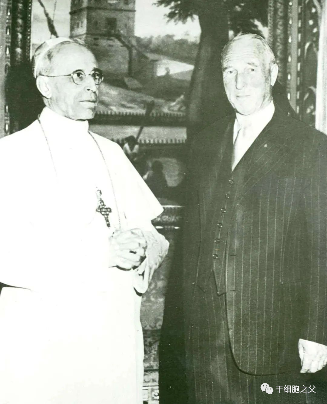 图:Paul Niehans医生与Pope Pius XII教皇这是一张划时代的照片,当教皇(左)同意与Paul Niehans医生合影并公开发表时:在我们这个星球上,上帝与细胞疗法站在一起。Paul Niehans医生的这种活细胞疗法(fresh cell therapy)被认为是细胞疗法的开端,而Niehans医生也被认为是“细胞疗法之父”。