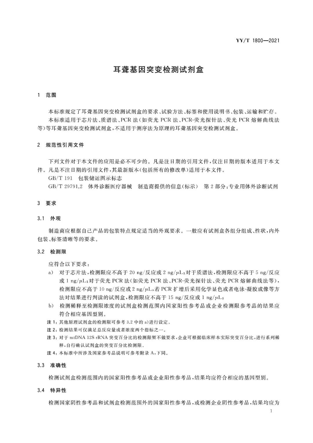 本标准适用于芯片法、质谱法、PCR法(如荧光PCR法、PCR-荧光探针法、荧光PCR熔解曲线法等)等耳聋基因突变检测试剂盒,不适用于测序法为原理的耳聋基因突变检测试剂盒。