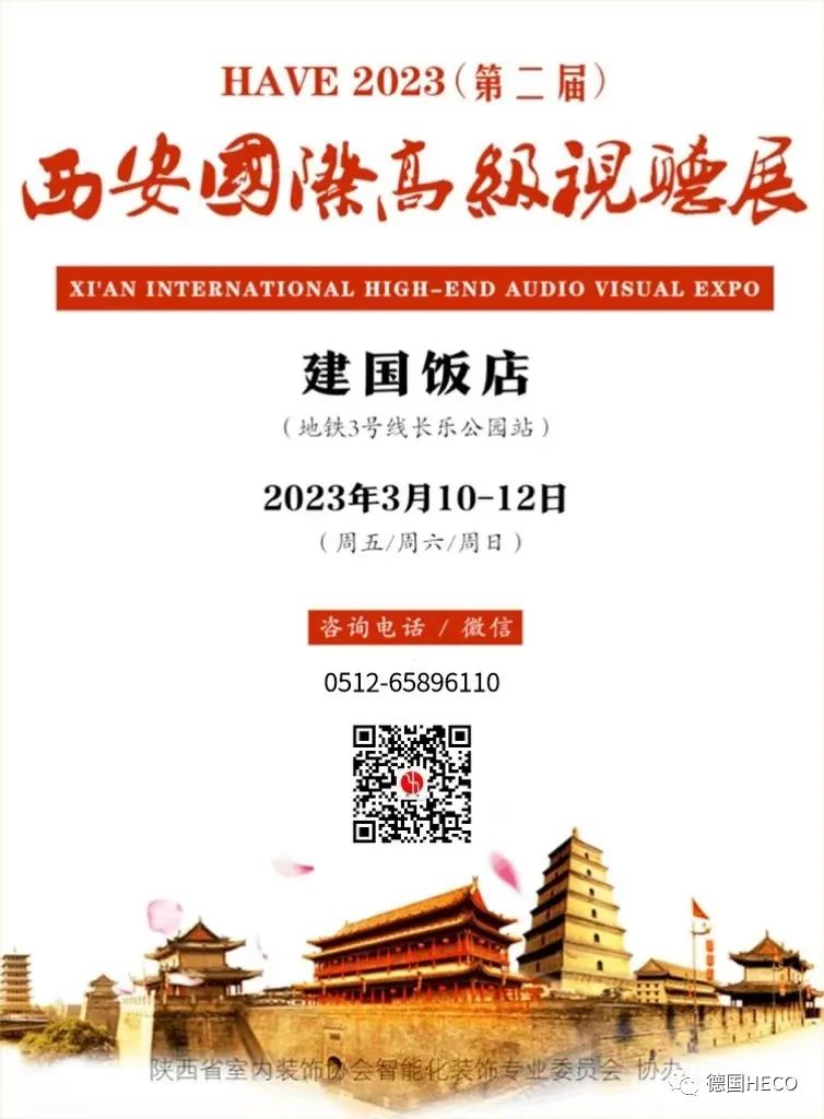 由HIFI说主办的“HAVE 2023西安国际高级视听展”定于2023年3月10-12日在西安建国饭店隆重举行,地铁3号线“长乐公园”站可到,届时苏州奕浩影音将携德国HECO音箱参展,展房号2125,期待您的莅临!