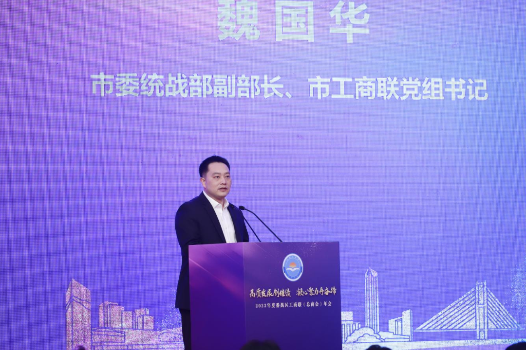 2月15日下午,番禺区工商联(总商会)在番禺宾馆举办“高质发展创佳绩 凝心聚力再奋蹄”2022年度年会。广州市委统战部副部长、市工商联党组书记魏国华,市工商联二级巡视员陈立,番禺区委书记黄彪,区委副书记、区长叶珊瑚,区人大常委会党组书记、主任徐永,区政协党组书记、主席覃海深等区领导班子成员,澳区全国人大代表、澳门工商联会会长、澳门番禺同乡会会长何敬麟,区工商联主席、总商会会长王锐祥,以及市委统战部、市工商联和区有关职能部门、人民团体、镇街等相关负责同志,区工商联(总商会)第十三届执委会全体成员、各商(协)会会长、秘书长和企业家代表近700人参加。