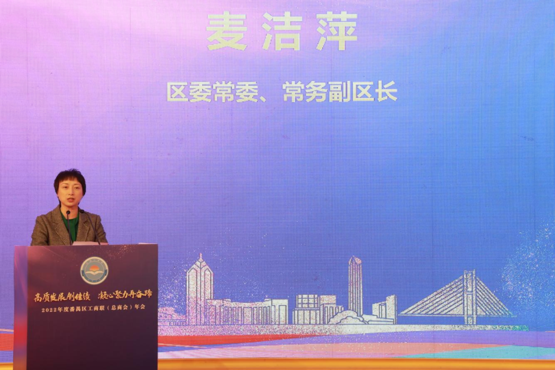 麦洁萍代表区委、区政府向一直以来关心支持番禺经济高质量发展的企业家和社会各界人士表示感谢。她指出,今年广州市委市政府赋予番禺“智造创新城”的新战略定位,番禺区将积极开展暖企走访活动,听取企业家呼声诉求,以更加务实有效的举措为企业高质量发展解难题、办实事,全力打造市场化、法治化、国际化营商环境。勉励广大民营企业家看好番禺、投资番禺、扎根番禺,聚焦高质量发展主题,坚持以实体经济为本,制造业当家,努力向“专精特新”方向发展,加快实现高水平科技自立自强,全方位提升产业链发展韧性和安全水平,共同推进“智造创新城”的建设。