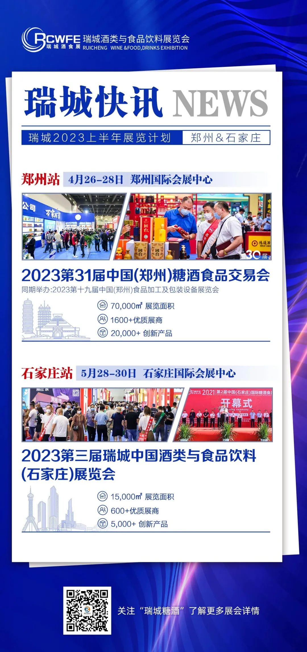作为疫情过后中部地区的首场年度大型专业糖酒会,2023第31届中国(郑州)糖酒食品交易会将于4月26—28日在郑州国际会展中心举办。同年5月28至30日,第三届瑞城石家庄酒食展也将在石家庄国际会展中心上演。