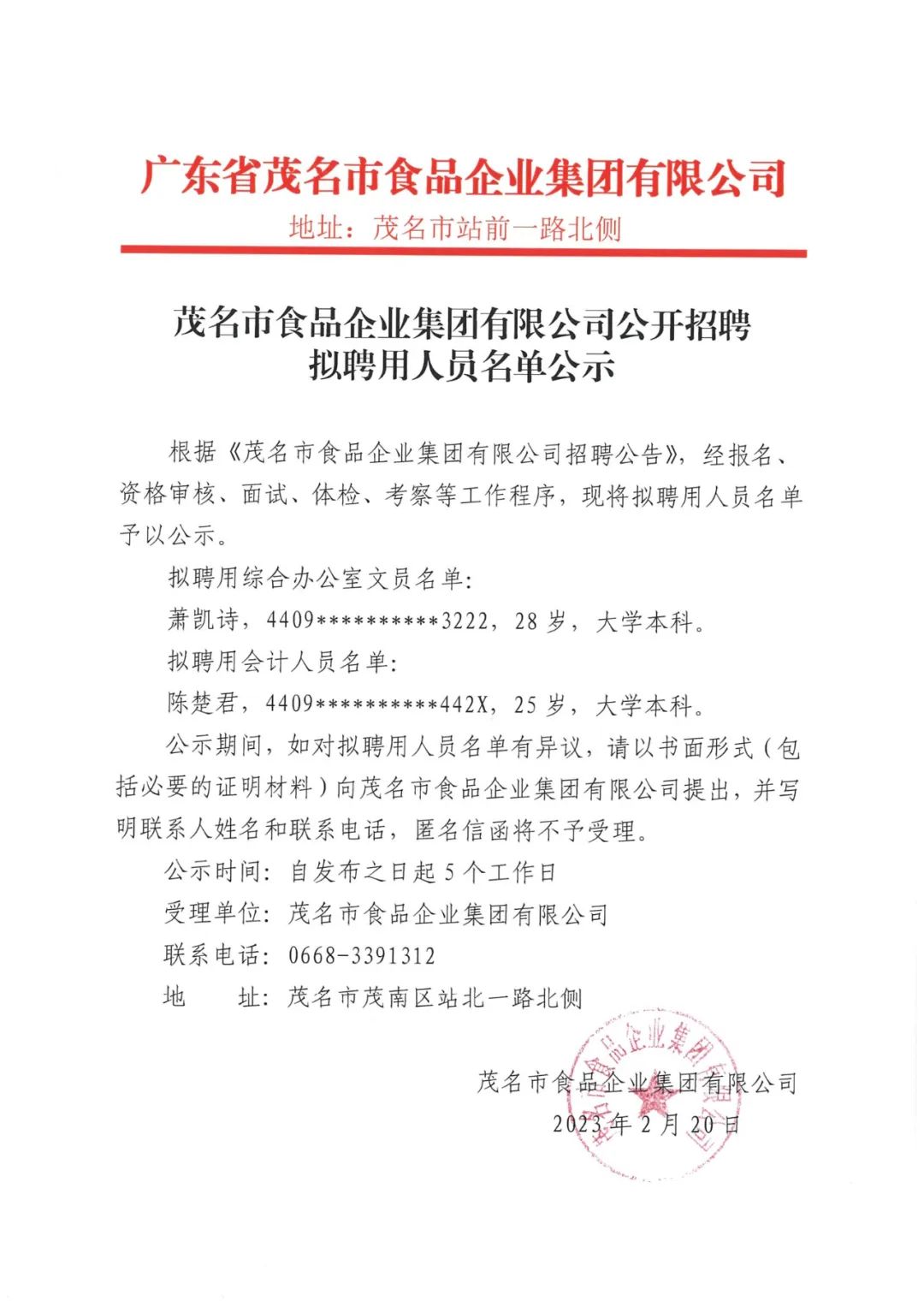 茂名市食品企业集团有限公司公开招聘拟聘用人员名单公示