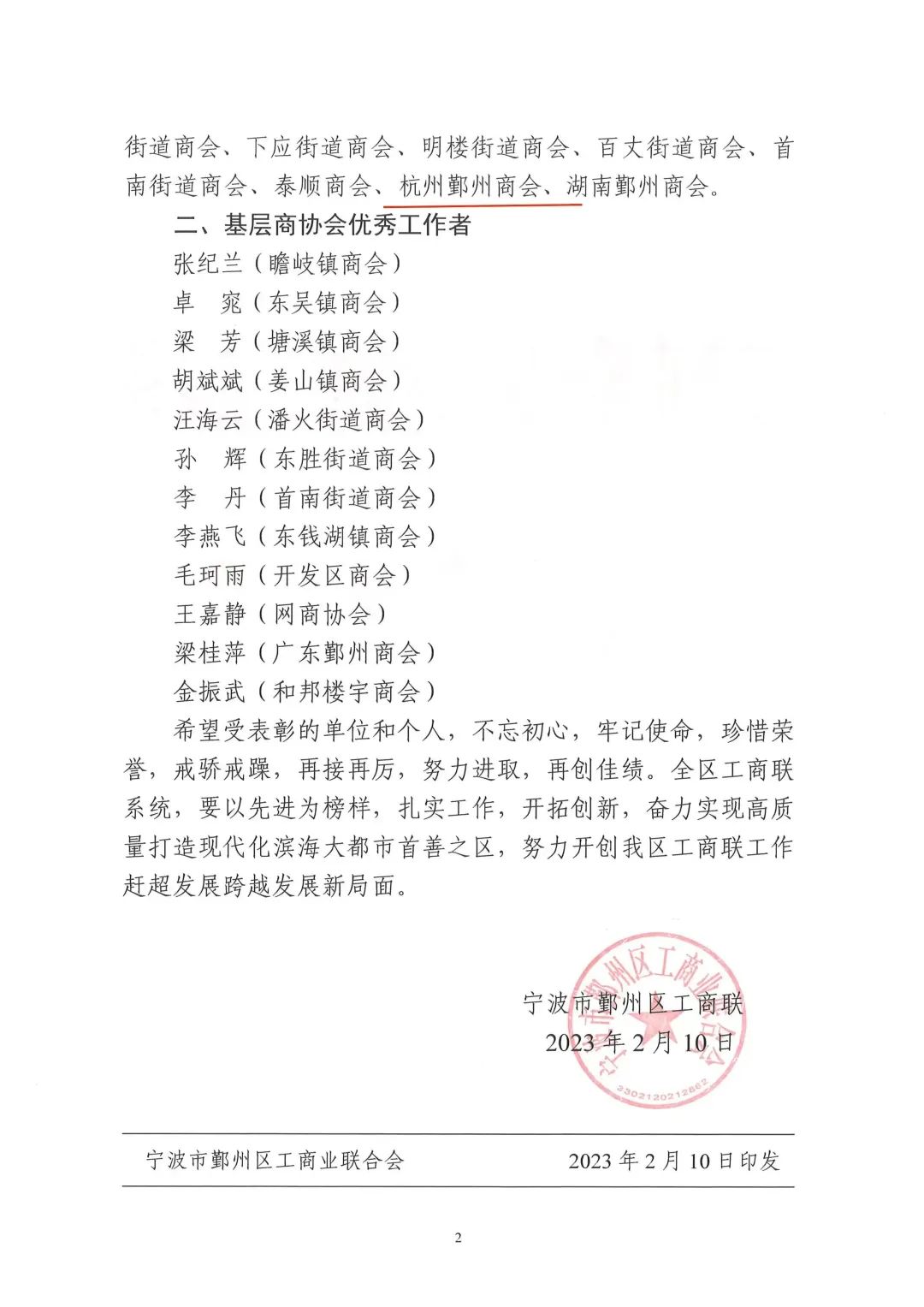 会议上,鄞州区工商联发布了《关于表彰2022年度先进基层商协会和基层商协会优秀工作者的通报》,杭州市鄞州商会再度获评“先进基层商协会”单位称号。