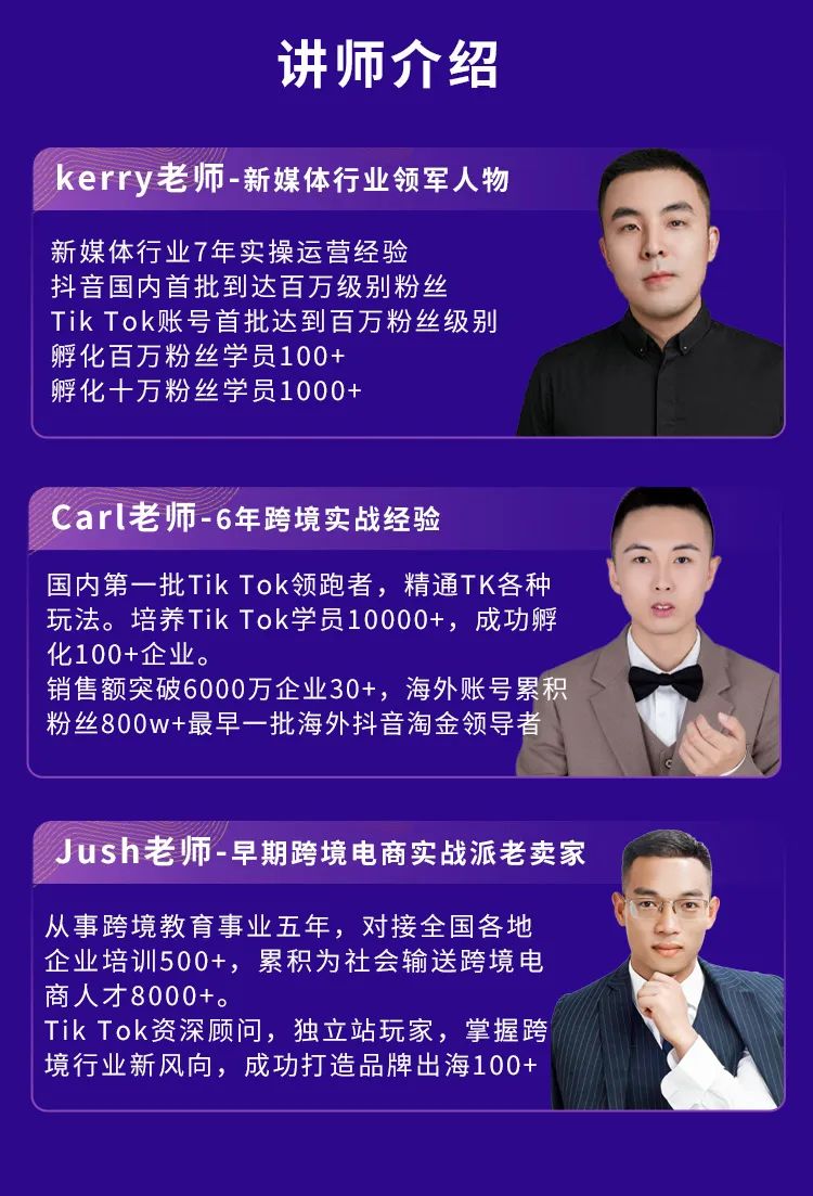 就比如:拥有新媒体行业7年实操运营经验的kerry老师,国内第一批Tik Tok领跑者的Carl老师等。