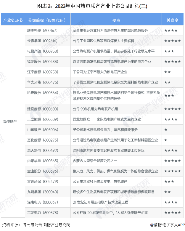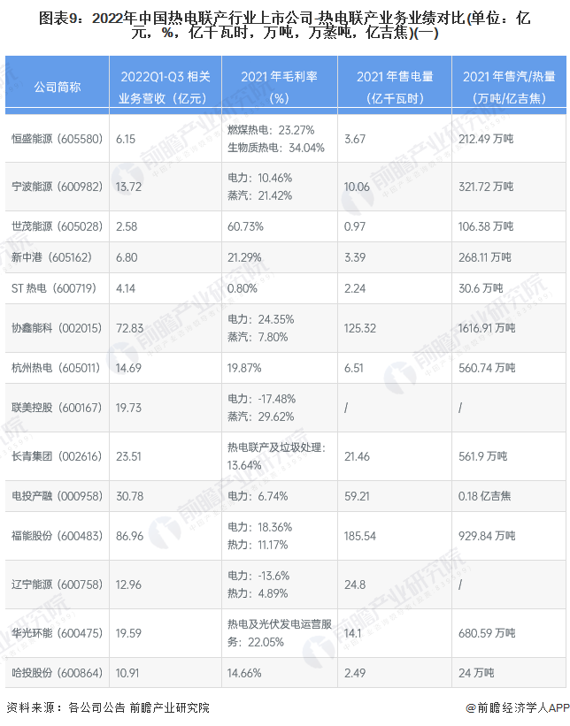 行业主要上市公司:深南电A(000037);京能电力(600578);哈投股份(600864);惠天热电(000692);宁波能源(600982)等。本文核心数据:行业上市公司营业收入;相关业务占比;相关业务收入;电力及热力销量。我国热电联产行业的发展受到国家政策的较大鼓励与支持。目前,我国热电联产行业的上市公司数量较多,分布在各产业链环节。其中,涉及热电联产的上市公司包括:恒盛能源、宁波能源、协鑫能科等。