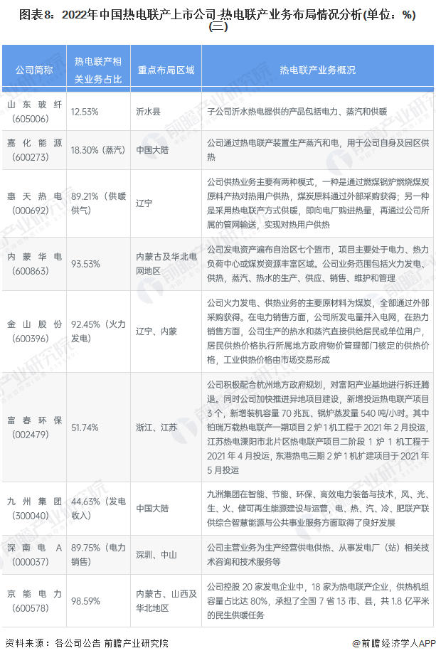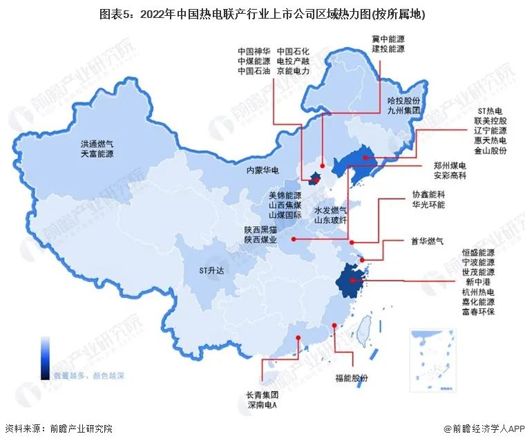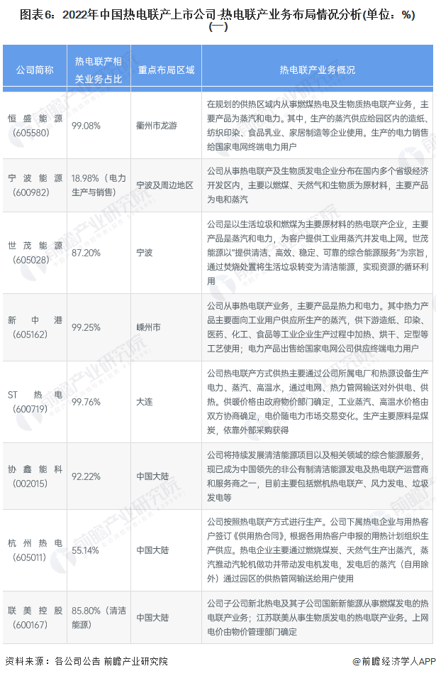 热电联产行业的上市公司中,大多数公司均布局在境内及公司所在地,恒盛能源、新中港、ST热电、写信能科等电力企业热电联产的相关业务占比较高。此外,大部分企业针对小部分特定区域或市进行供电及供热,受电力及蒸汽产量有限及较远传输将造成能量损耗影响,较少企业向其它地区供给。注:部分上市公司未直接公布热电联产业务营收占比,业务占比的具体统计口径标注在括号内