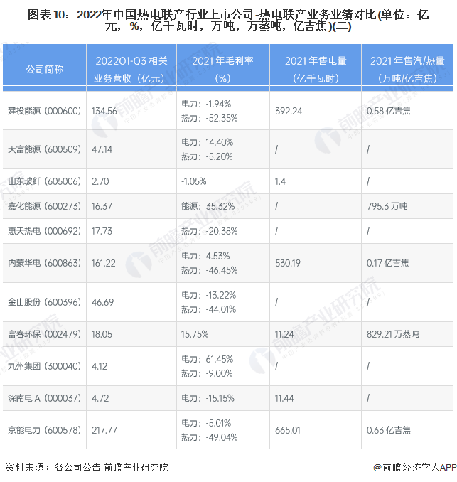 从上市公司热电联产相关营收来看,2022年前三季度,建投能源、内蒙华电以及京能电力的相关业务营收超过100亿元;从上市企业相关业务毛利率情况来看,各企业业务的毛利率差异明显,如世茂能源热电联产业务毛利率超60%,ST热电相关业务的毛利率仅0.8%。从2021年相关企业的电力销售量来看,建投能源、内蒙华电以及京能电力的售电量最高,其中,京能电力的售电量达到665.01亿千瓦时;从售汽/热量来看,协鑫能科的售热量最高,达到了1616.91万吨。注:截至2023年2月,大部分企业未发布2022年财报,部分数据采用2021年数据。