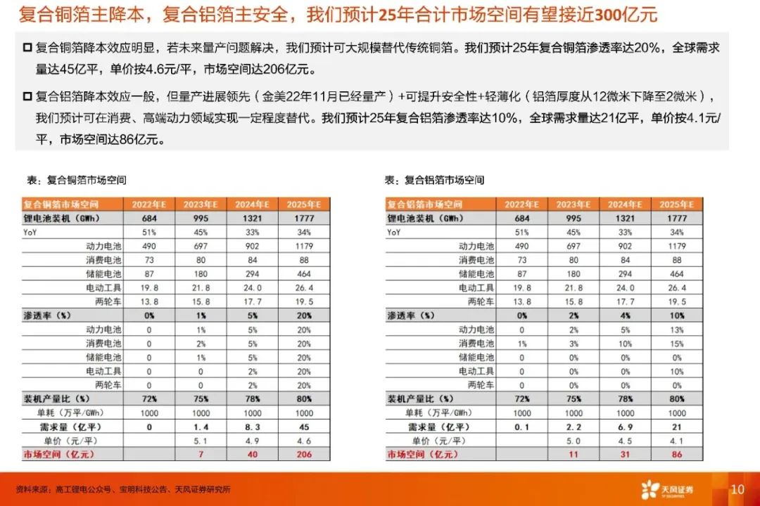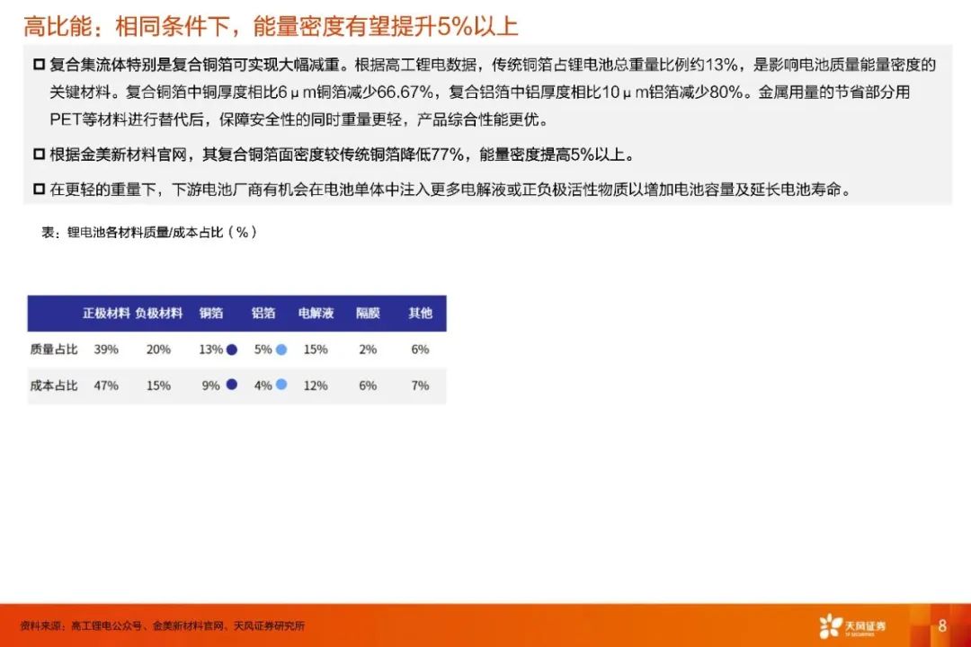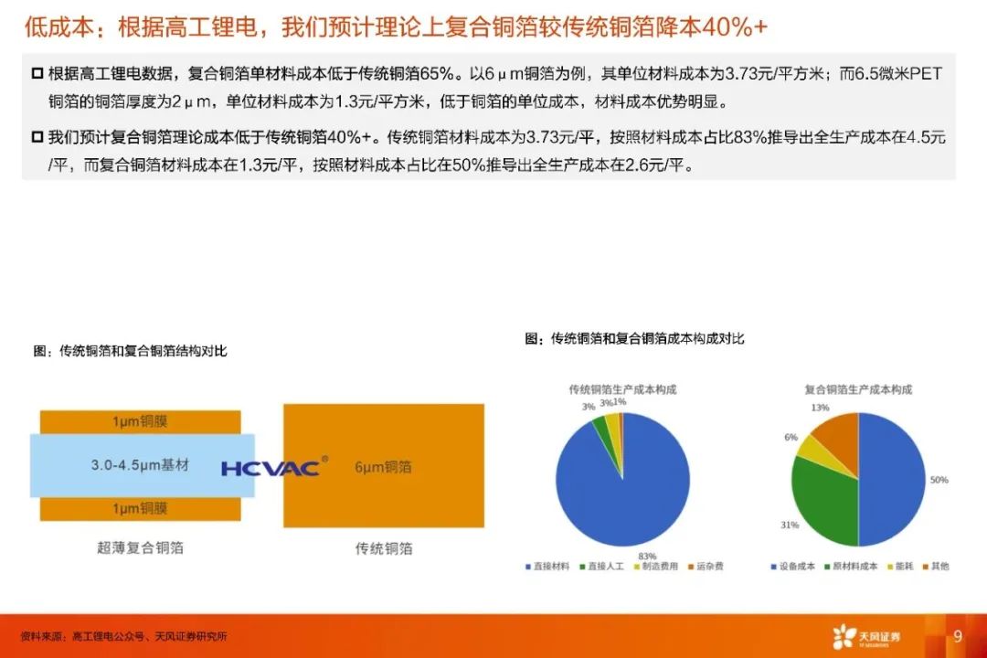 复合铜箔按照目前设备效率,考虑一定良品率,理论计算已有经济性,复合铝箔暂无。复合铜箔理论计算成本低于电解铜箔,但由于产业尚无大规模量产交付产线,实际运行效率、成本未知。