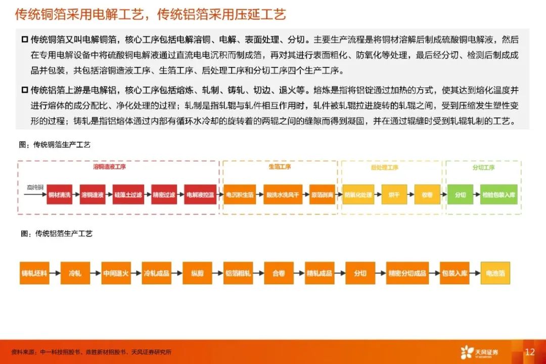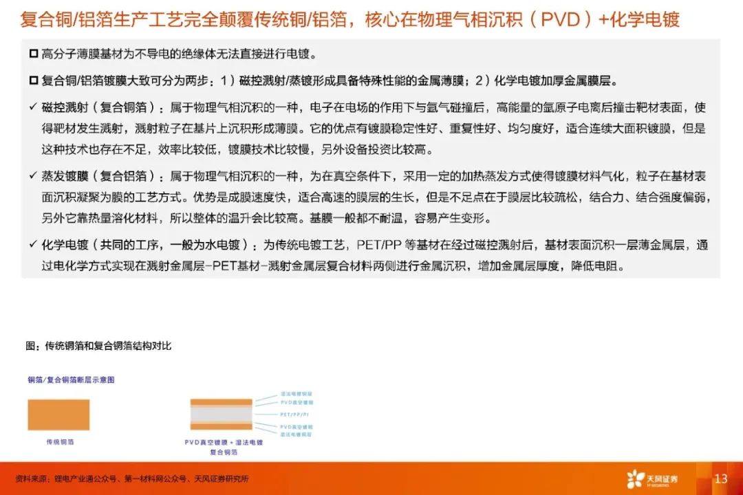 复合集流体生产颠覆传统集流体生产工艺,是不可多得的0-1细分赛道。传统铜箔采用电解工艺,传统铝箔采用压延工艺,复合铜/铝箔生产工艺主要为物理气相沉积(PVD)+化学电镀。