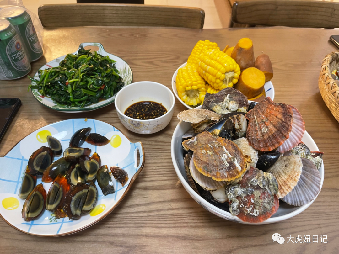 老闺蜜使出浑身解数,连玉米地瓜和馄炖加起来整了四菜一汤。红的绿的黄的,煞是好看。