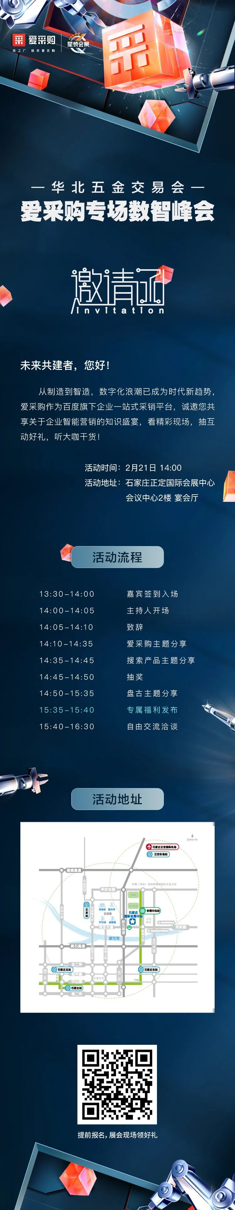 数字化浪潮已经成为时代的新趋势,五金行业如何更好更快地融合时代风向走向转型升级?市场复苏,如何寻求先机找到“纾困之法”?打开产品销路的新方向又在哪里?这一切,将在爱采购专场数智峰会现场找到答案,行业大咖、营销专家现场为您解答!2月21日下午14:00在石家庄国际会展中心,会议中心2楼宴会厅,到场即可领好礼。