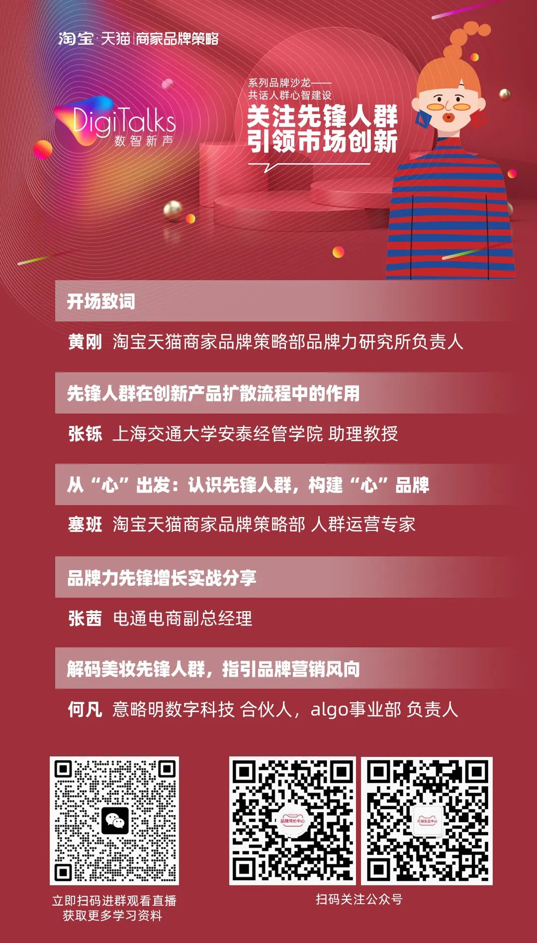 在数字化已成为企业所共识的经营转型大势的当下,我们每个人都是在这片海洋中探索的船只,海洋宽广而我们没有一个人是孤独的,我们不仅在不断的实践中寻找DTC经营的方法和能力,也在持续倾听其他同行者的声音。天猫作为品牌DTC数字化经营主阵地,不仅致力于为品牌提供完善的基础设施和创新空间,也联合各领域专家和优秀的生态伙伴助力品牌的数字化经营。在这样的背景下【DigiTalks 数智新声】系列品牌沙龙应运而生,作为企业DTC经验思想交流平台,旨在与有志于数字化发展的品牌面对面,就共同关心的DTC经营主题共享新知,探索新路,为商家品牌的经营加油助力。品牌作为消费者与企业商品的无形桥梁,是企业的重要资产也是品牌长期主义经营思维的关键落点。而品牌的建设也从简单的追逐流量与曝光,越发转向围绕目标消费者的更深层心智塑造,相伴而生的则是对消费者更细分化的洞察与心智建设。早在2019年就与贝恩公司合作率先推出了8大策略人群体系,助力品牌目标人群心智的精益化建设。2021年天猫联合罗兰贝格发布了天猫品牌力模型,品牌的抽象化心智首次得以通过大数据方式量化呈现。本周情人节天猫首次基于天猫策略人群和品牌力模型发布了天猫新世代、资深白领和先锋人群的挚爱品牌。(特别的爱给特别的你——天猫人群挚爱品牌TOP50真情发布)作为后续,我们将在2月21日14:00举办【Digitalks数智新声】系列品牌沙龙——聚焦先锋人群的品牌心智建设。届时将有来自淘宝天猫商家品牌策略部的人群运营专家 纹云、上海交通大学安泰经管学院助理教授 张烁、电通电商副总经理 张茜、意略明数字科技合伙人/algo事业部负责人 何凡,一起分享各自的观点,共同探讨先锋人群的创新发展机会。欢迎预约观看沙龙精彩直播!
