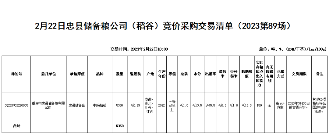 2月22日忠县储备粮公司(稻谷)竞价采购交易会公告(2023第89场)