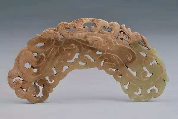 汉代的玉龙更是千姿百态,思想开放的新时代带给玉龙更大的遨游空间,新的审美意识有助于玉龙的塑造。汉代盛行神学思想,更加渲染了龙的神性,而使人望而生畏。它能腾云驾雾、呼风唤雨,“龙嘘气成云”、“龙举而景云属”,龙是天上的神灵。
