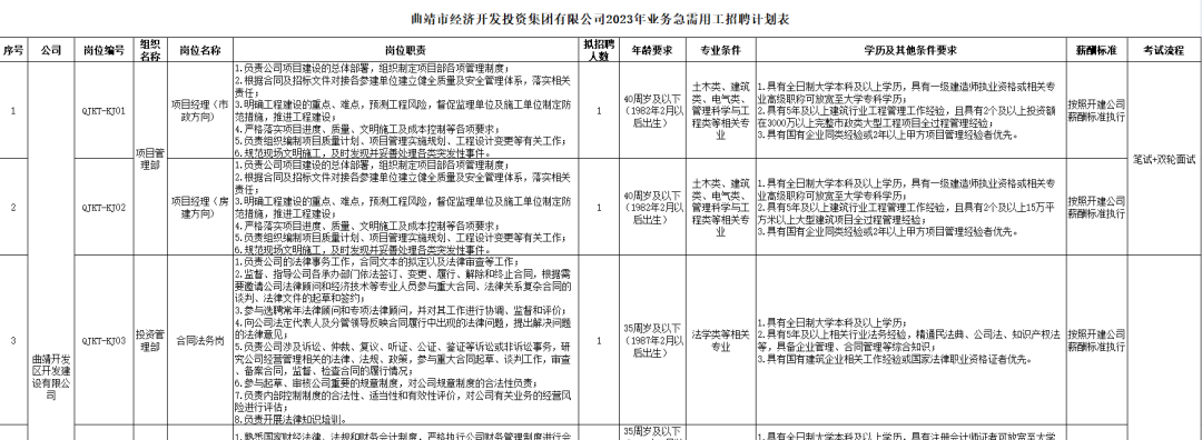 市经开投集团下属子公司本次面向社会招聘21个岗位,共26人。详见附件《曲靖市经济开发投资集团有限公司2023年业务急需用工招聘计划表》(以下简称“招聘计划表”)。