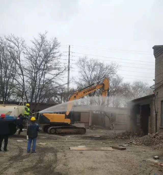 首日施工现场以拟建厂房新址上旧建、构筑物拆除为主,现场按预定方案提前断水断电,清空可利用物料,设置临时警戒线,采取有效抑尘措施。施工过程在确保安全、环保的前提下有序推进,全天拆除各类构筑物投影面积超过1800平方米。