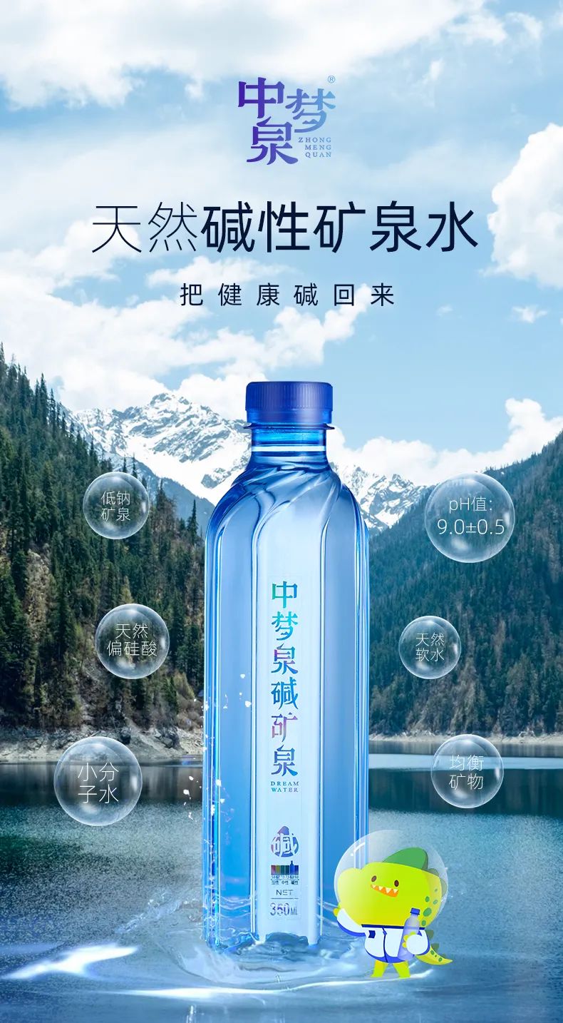 中梦泉顺应时代潮流和趋势以全球化视野配置资源、拓展市场,以成熟和自信,在自由开放的经济体系中赢得商业成功,致力于打造国内首款功能性矿泉水,引领饮水大健康时代,中梦泉把健康碱回来。