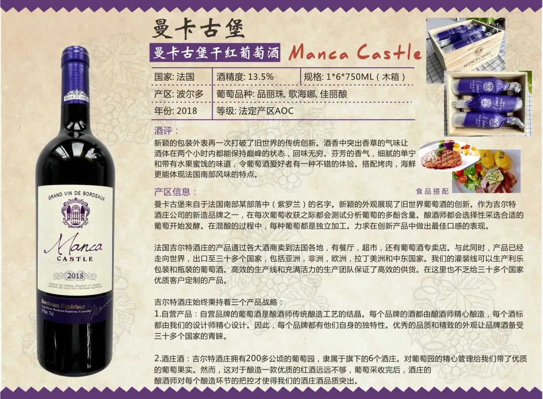 曼卡古堡干红葡萄酒新颖的外观展现了旧世界葡萄酒的创作,在每次葡萄收获之际都会测试分析葡萄的多酚含量。酿酒师都会选择性采选合适的葡萄开始发酵。在混酿的过程中,每种葡萄都是独立加工,力求在创新产品中做出佳口感的表现。