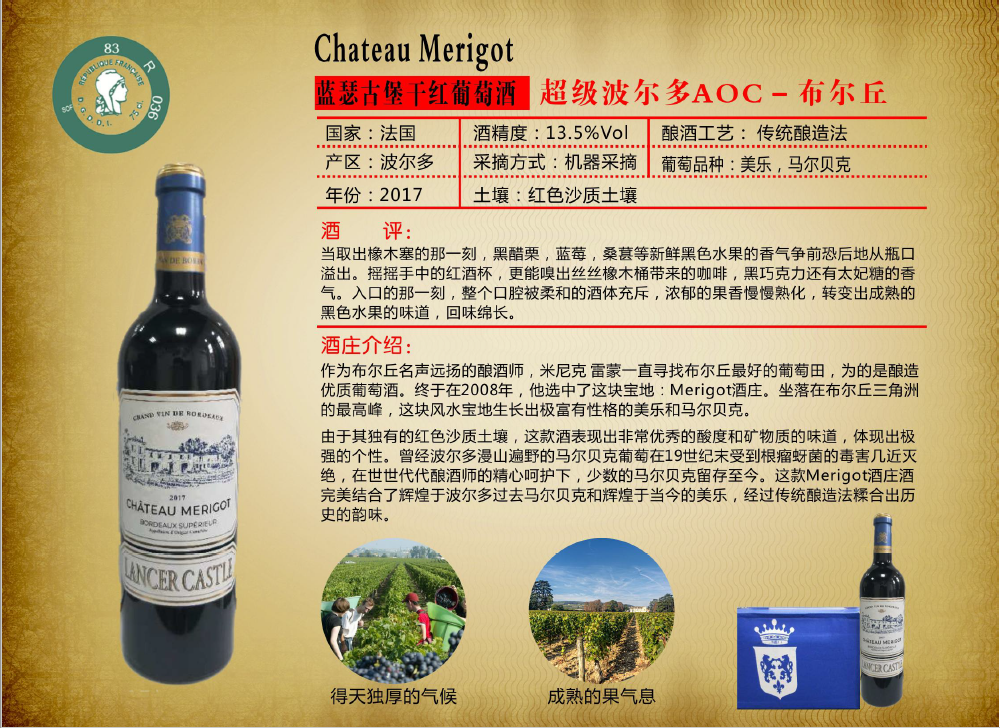Merigot酒庄位于布尔丘三角洲的高峰,这块风水宝地生长出富有性格的美乐和马尔贝克,其特殊的红色沙质土壤,表现出非常好的酸度和矿物质的味道。