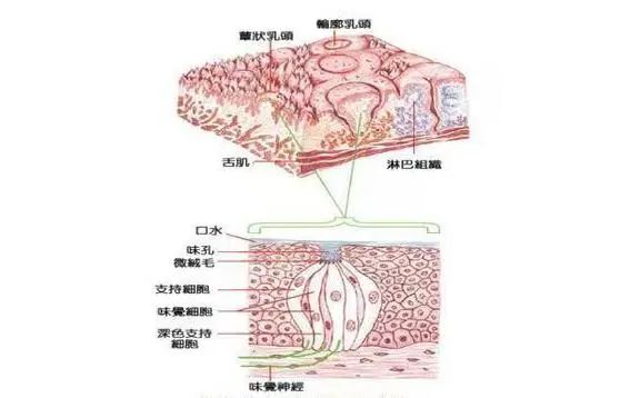 味道的感知是大脑与口腔器官协同作用的结果。人类的舌面有许多细小的舌乳头:舌乳头上有一个到上百个味蕾,每个味蕾有50~150个味受体细胞,众多受体细胞让一个味蕾可同时辨别五种基本味道。味蕾呈卵圆形花苞状,由支持细胞和味蕾细胞组成,有味孔伸向舌表面,白酒中的呈味物质与味蕾接触产生刺激信号,刺激信号再以脉冲形式通过神经系统传至大脑,经分析后产生味觉。可感受口腔内白酒的酸甜苦咸鲜。