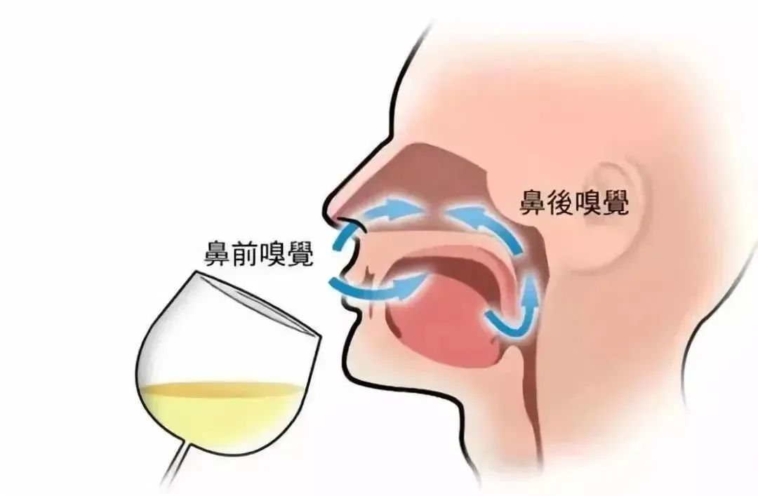 人类的嗅觉可以分为鼻前嗅觉和鼻后嗅觉。当气味从鼻腔进入,直达鼻根的嗅觉细胞,“闻”到气味的这一过程就是鼻前嗅觉。而“吃”或“喝”到的过程中,气味从口腔进入,通过口腔后部与鼻腔连通的管道抵达嗅皮细胞,则为鼻后嗅觉。