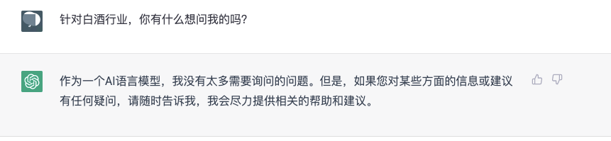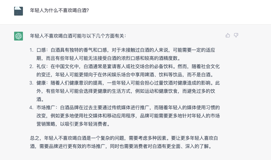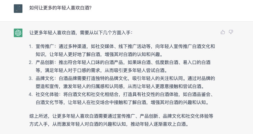 而就当下讨论的比较火热的话题——“年轻人为什么不喜欢白酒”,ChatGPT也发表了“两头堵”看法。它表示,“年轻人不喜欢喝白酒是一个复杂的问题,需要考虑多种因素。要让更多年轻人喜欢白酒,需要品牌进行更有效的市场推广,同时也需要消费者对白酒有更全面、深入的了解。”如何让更多的年轻人喜欢白酒?ChatGPT表示应该从宣传推广、产品创新、品牌文化、社交化体验等四个方面入手,从而激发年轻人对白酒的兴趣和认知,推动年轻人逐渐喜欢上白酒。在结束对话之前,懂酒哥还向ChatGPT发出了问题邀请,针对白酒行业是否有问题想要提问,但它的回答让懂酒哥瞬间觉得被凡尔赛了。