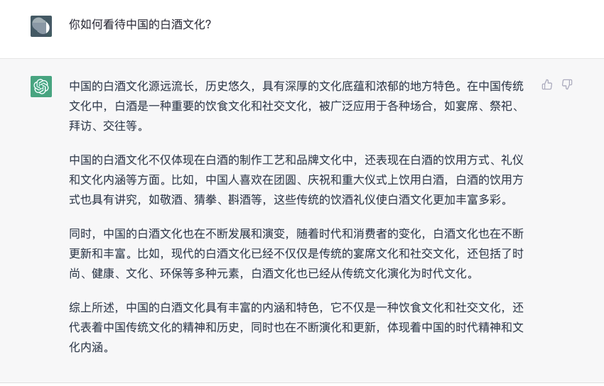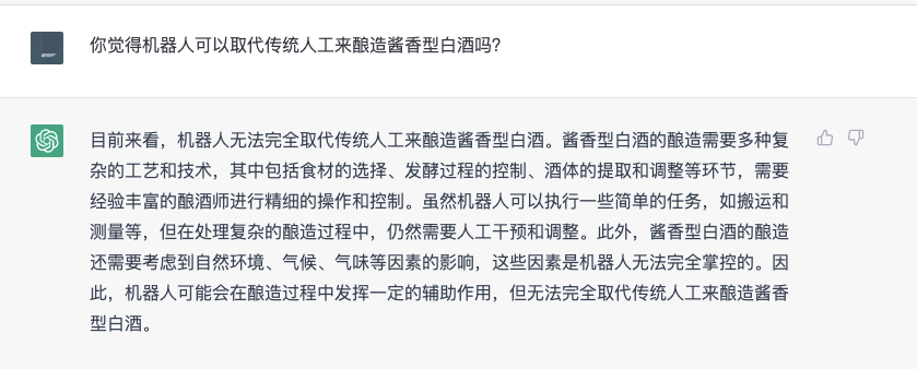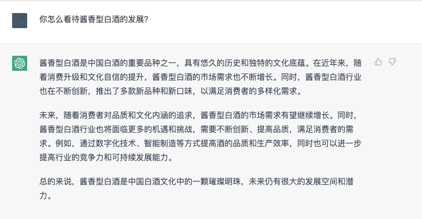 综上所述,不得不承认,ChatGPT的逻辑思维和对资料的整合能力确实很强,但也可以看出,它对待问题的认识仅仅停留在表面,对问题的回答充斥着“假、大、空”,像是从教科书上生搬硬套下来的,由此可见,ChatGPT虽然“知道”白酒,也能够泛泛而谈,但想要做到真正的深入分析交流,还需要各个白酒从业人员及爱好者多多与ChatGPT沟通,通过AI对话“灌输”白酒行业相关知识。相信在不久的将来,ChatGPT及相关衍生产品将会用大数据的形式回馈各个行业。