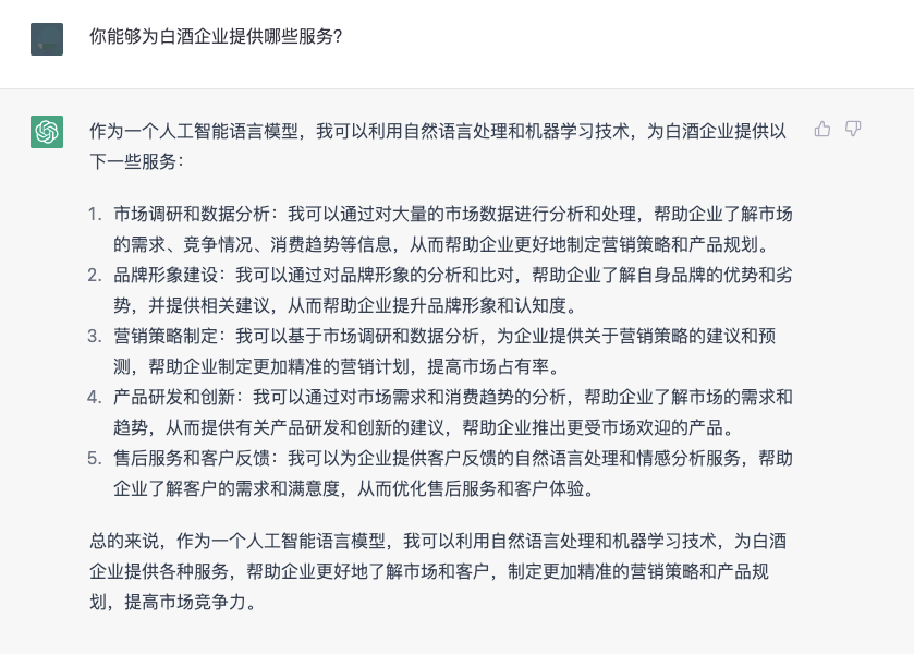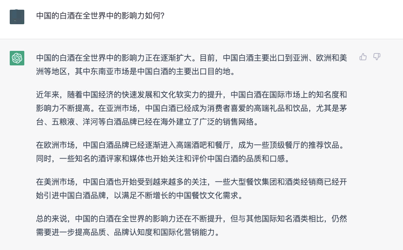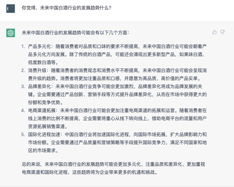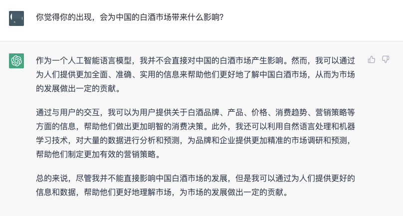 ChatGPT觉得自己的出现会给白酒市场带来影响吗?对此,ChatGPT对自己有着清醒的认知。它表示,“作为一个人工智能语言模型,我并不会直接对中国的白酒市场产生影响。然而,我可以通过为人们提供更加全面、准确、实用的信息来帮助他们更好地了解中国白酒市场,从而为市场的发展做出一定的贡献。”“尽管我并不能直接影响中国白酒市场的发展,但是我可以通过为人们提供更好的信息和数据,帮助他们更好地理解市场,为市场的发展做出一定的贡献。”可以看出,ChatGPT还是有点“小骄傲”的。那么,ChatGPT能够为白酒企业提供哪些服务呢?针对这个问题,ChatGPT从市场调研和数据分析、品牌形象建设、营销策略定制、产品研发和创新、售后服务和客户反馈五个方面进行的阐述,它表示,“作为一个人工智能语言模型,我可以利用自然语言处理和机器学习技术,为白酒企业提供各种服务,帮助企业更好地了解市场和客户,制定更加精准的营销策略和产品规划,提高市场竞争力。”在ChatGPT眼中,白酒行业的发展趋势是什么?ChatGPT的回答显得有些官方,“未来中国白酒行业的发展趋势可能会更加多元化、注重品质和差异化、更加重视电商渠道和国际化进程,这些趋势将为企业带来更多的机遇和挑战。”在ChatGPT眼中,白酒的国际影响力如何?它表示,中国的白酒在全世界中的影响力正在逐渐扩大。目前,中国白酒主要出口到亚洲、欧洲和美洲等地区,其中东南亚市场是中国白酒的主要出口目的地。但ChatGPT也直言,“中国的白酒在全世界的影响力还在不断提升,但与其他国际知名酒类相比,仍然需要进一步提高品质、品牌认知度和国际化营销能力。”对于大火的“酱酒热”,ChatGPT也发表了自己的看法,“酱香型白酒作为中国传统的名优白酒之一,自然也拥有着广泛的市场和消费群体。近年来,随着国内消费升级和消费者口味的多样化,酱香型白酒的消费市场也逐渐扩大,呈现出一定的热潮。同时,一些知名的酱香型白酒品牌也逐渐成为了国内消费者心目中的高品质白酒代表。但需要注意的是,随着消费市场的不断变化和多元化,消费者的口味也在不断变化,酱香型白酒需要不断创新和适应市场需求,才能在市场上保持竞争力。”在ChatGPT看来,酱香型白酒是中国白酒文化中的一颗璀璨明珠,未来仍有很大的发展空间和潜力。ChatGPT对“年轻人为什么不喜欢白酒”问题的看法