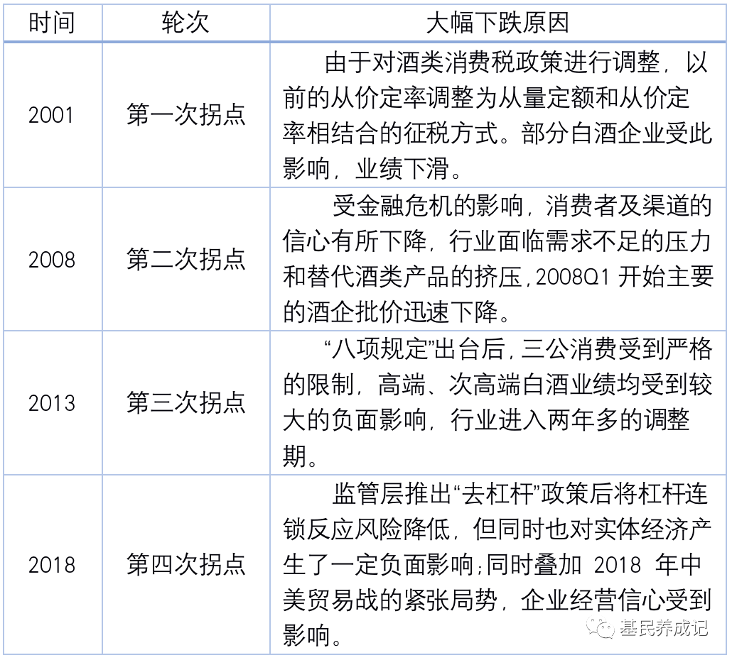 通过对 2001、2008、2013、2018 年三轮白酒市场的大幅下跌进行复盘发现,过去几轮白酒板块的大幅度调整,主要为需求端的问题,在调整期间业绩下滑,而在经历了三公经费限制后,白酒消费的结构已转向民间和商务消费为主的较为健康的结构,需求侧稳定性加强。