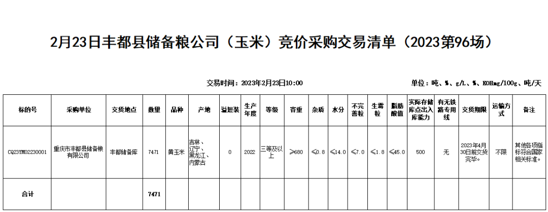 受重庆市丰都县储备粮有限公司委托,重庆市粮油批发市场有限责任公司(即国家粮食重庆交易中心,以下简称“批发市场”)定于2023年2月23日10:00举办丰都县储备粮公司(玉米)竞价采购交易会,现将有关事项公告如下:2. 产地、年限及数量:吉林、辽宁、黑龙江、内蒙古2022年产黄玉米7471吨。4. 交货地点:重庆市丰都县储备粮有限公司丰都储备库。5. 质量要求:一是符合玉米国标(GB1353-2018)三等及以上质量标准,其中:容重≥680g/L;水分≤14.0%(水分在14.1%-14.5%的每超0.1个百分点扣量0.12%,超14.5%拒收);杂质≤0.8%(杂质超标需整理达标后入库,筛下物由卖方承担);不完善粒≤7.0%;生霉粒≤1.8%。二是符合玉米储存品质判定规则(GB/T20570-2015)宜存标准,其中:脂肪酸值≤45.0mgKOH/100g。三是符合食品安全国家标准食品中污染物限量(GB2762-2017)指标。四是符合食品安全国家标准食品中农药最大残留限量(GB2763-2021)指标。五是符合食品安全国家标准食品中真菌霉毒素限量(GB2761-2017)指标,其中呕吐毒素≤800ug/kg。六是其他各项指标必须符合国家相关标准,无虫蛀,无异味,无活虫。七是严禁掺杂以前年度陈粮。八是卖方交货时,必须向买方提供本批次粮食一个月以内的由有资质的检验机构出具的质量检验报告。6. 数量、质量验收:数量以重庆市丰都县储备粮有限公司丰都储备库地磅数量为准。质量以到库综合扦样检验为准。粮食到达交货地点后,买方(或买方指定的企业)进行初检,初检结果仅作为是否入库的初步判断依据,不作为验收时是否合格的依据。初检合格的粮食方可入库,初检不合格的粮食可拒收。标的粮食入库完毕后,整仓质量经重庆具有国家资质的专业质检机构对粮食质量进行检验,该检验结果作为买方验收依据。7. 本次交易清单附后。具体交易品种和数量等信息如有变化,以即时公告及交易清单为准。1. 报名资格:国内具有粮油生产、经营资格的企业且在国家粮食电子交易平台注册的有效会员。2. 报名时间:2023年2月23日8:00前。报名参与交易即视作全面承认并遵守《重庆市地方政府储备竞价采购交易规则》和交易公告、交易清单等要求。1. 本次竞价交易使用国家粮食交易平台地储交易系统,2023年2月23日10:00通过网络对委托标的依次按交易节进行交易。请报名参加竞价交易的会员按时登录国家粮食交易中心官网(www.grainmarket.com.cn)→点击网页上方“请登录”或右方“用户中心”进行会员登录→点击“交易”板块→选择“重庆市场”→“2月23日丰都县储备粮公司(玉米)竞价采购交易专场”。1. 保证金的收取和释放:参与竞价交易的买卖双方须交纳保证金110元/吨(其中:履约保证金100元/吨和交易保证金10元/吨)。卖方保证金须在竞价采购交易会开始前2个小时汇至批发市场指定银行账户;买方保证金须在提交委托交易清单当日汇至批发市场指定银行账户。单笔合同交割完毕后,保证金释放。如合同部分交割,该合同数量的所有保证金处于冻结状态。2. 保证金转入:汇款时请备注“保证金”,待资金到账后,进入系统“用户中心”的资金界面,点击用户名称下方的“交易账户:明细”,将足额保证金“转入”重庆市场。3. 交易手续费:按成交金额的2.0‰向卖方收取。1. 成交价格:到达重庆市丰都县储备粮有限公司丰都储备库仓前交货价。2. 合同签订:自成交之日起3个工作日内买卖双方在交易系统内签订电子购销合同或以邮寄、扫描等方式签订,如逾期未签订购销合同,则对违约方作违约处理。3. 入库及付款:卖方须在2023年4月30日前交货完毕。买方须于成交之日起按进度将货款一次或分批汇入批发市场指定银行账户。当货物到达交货地点后,由重庆市丰都县储备粮有限公司检验人员检斤验质。4. 结算:粮食初检合格入库后,双方按入库进度可分批签订《验收确认单》,批发市场按《验收确认单》数量在3个工作日内支付卖方90%货款。合同执行完毕后,整仓粮食由具有国家资质的专业质检机构检验合格并收到卖方开具的足额发票后,买卖双方再次签订《验收确认单》,由卖方送达批发市场,批发市场在3个工作日内按《验收确认单》将剩余货款拨付给卖方。2. 开户银行:中国农业银行股份有限公司重庆九龙坡中梁山支行 3. 账 号:31-0707010400088881. 本场交易规则详见“重庆粮网”(www.grainmarket.com.cn/centerweb/region/CQ)、“重庆粮食集团”官网(www.cqgrain.com)《重庆市地方政府储备竞价采购交易规则》,与此规则不一致的以本次公告为准。2. 会员成交后到委托方指定交货地点交货时,需遵守当地的疫情防控政策,做好疫情防控工作。3. 各会员单位发现以陈顶新、转圈粮、套取财政补贴、人为设置障碍造成入库难等违法违规问题的,请拨打12325举报。4. 市场交易部联系电话:023-65269777 023-65269283