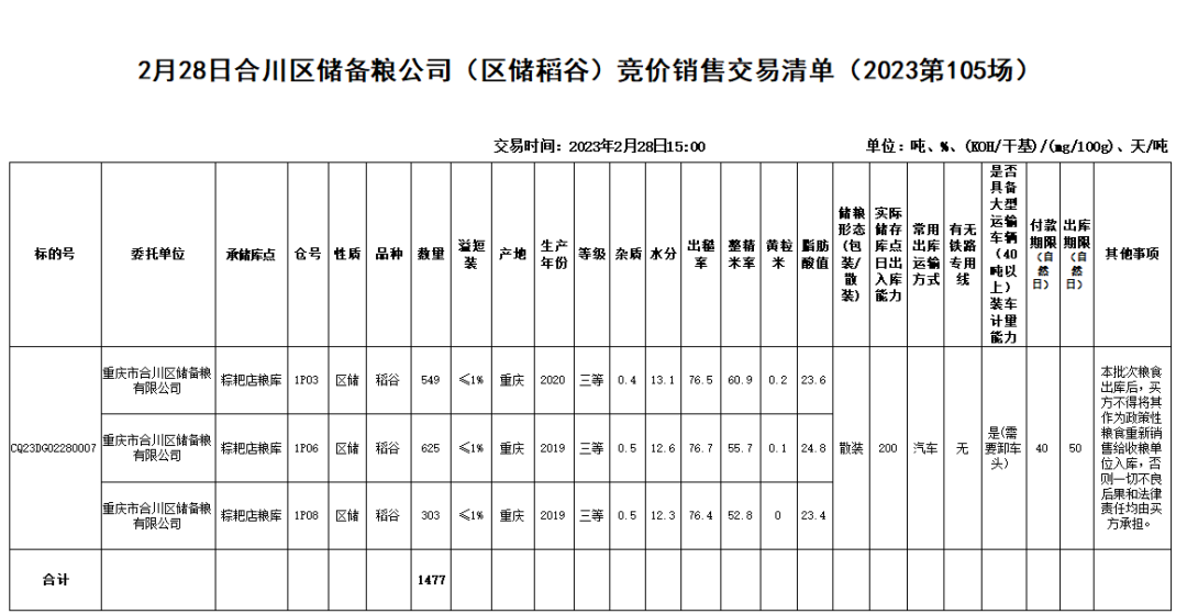 受重庆市合川区储备粮有限公司委托,重庆市粮油批发市场有限责任公司(即国家粮食重庆交易中心,以下简称“批发市场”)定于2023年2月28日15:00举办合川区储备粮公司(区储稻谷)竞价销售交易会,现将有关事项公告如下:2. 产地、年限及数量:重庆2019年产稻谷928吨,重庆2020年产稻谷549吨,合计1477吨。3. 承储库点及仓号:合川粽耙店粮库1P03、1P06、1P08号仓。4. 标的质量:以交易清单质量指标为准。有意向参与交易的会员可通过“重庆粮网”(www.grainmarket.com.cn/centerweb/region/CQ)、“重庆粮食集团”官网(www.cqgrain.com)→资料下载→《竞价销售粮油看样单》路径,填写后加盖公章邮寄或扫描至批发市场,经批发市场审核盖章后,提前实地查看粮食实物质量和路况、出库条件等情况,确保所竞买的粮油符合自身使用用途,自主确定是否购买,并承担竞买后相应责任和市场风险。如未提前看样或看样后参与交易的,均视同认可标的质量,成交后不得再对质量提出异议。5. 本次交易清单附后。具体交易品种和数量等信息如有变化,以即时公告及交易清单为准。1. 报名资格:国内具有粮油生产、经营资格的企业或个人且在国家粮食交易平台注册的有效会员。2. 报名时间:2023年2月28日13:00前。报名参与交易即视作全面承认并遵守《重庆市地方政府储备竞价销售交易规则》和交易公告、交易清单等要求。1. 本次竞价交易使用国家粮食交易平台地储交易系统,2023年2月28日15:00通过网络对委托标的依次按交易节进行交易。请报名参加竞价交易的会员按时登录国家粮食交易中心官网(www.grainmarket.com.cn)→点击网页上方“请登录”或右方“用户中心”进行会员登录→点击“交易”板块→选择“重庆市场”→“ 2月28日重庆市地方储备粮(合川稻谷)竞价销售交易专场”。1. 保证金的收取和释放:参与竞价交易的买卖双方各须交纳保证金110元/吨(其中:履约保证金100元/吨和交易保证金10元/吨)。买方保证金须在竞价销售交易会开始前2个小时汇至批发市场指定银行账户;卖方保证金须在提交委托交易清单当日汇至批发市场指定银行账户。单笔合同交割完毕后,保证金释放。如合同部分交割,该合同数量的所有保证金处于冻结状态。2. 保证金转入:汇款时请备注“保证金”,待资金到账后,进入系统“用户中心”的资金界面,点击用户名称下方的“交易账户:明细”,将足额保证金“转入”重庆市场。3. 交易手续费:按成交金额的1.5‰向买方收取。1. 成交价格:为交易系统确认价格,即卖方承储库仓(罐)前散装车板交货价格,不含包装及整理费用,无出库费,无水、杂增扣量。如买方有包装以及整理要求,可与卖方协商,费用按照协商一致的标准另行结算。2. 合同签订:自成交之日起3个工作日内买卖双方在交易系统内签订电子购销合同或以邮寄、扫描等方式签订,如逾期未签订购销合同,则对违约方作违约处理。3. 付款及出库:买方自成交之日起40天内付款完毕,50天内出库完毕。买方成交后将货款一次或分批汇入批发市场指定银行账户。出库前,买方在“我的合同”中点击“支付货款”来完成出库通知单申请。批发市场收到申请后,及时审核并开具《出库通知单》。4. 结算:出库完毕后买卖双方签订《验收确认单》,由卖方送达批发市场,批发市场在2个工作日内按《验收确认单》办理货款结算。2. 开户银行:中国农业银行股份有限公司重庆九龙坡中梁山支行 3. 账 号:31-0707010400088881. 本次交易规则详见“重庆粮网”(www.grainmarket.com.cn/centerweb/region/CQ)、“重庆粮食集团”官网(www.cqgrain.com)《重庆市地方政府储备竞价销售交易规则》,与此规则不一致的以本次公告为准。2. 会员在交易前到委托方存储库点看样或成交后到委托方存储库点提货时,需遵守当地的疫情防控政策,做好疫情防控工作。3. 本批次粮食出库后,买方不得将其作为政策性粮食重新销售给收粮单位入库,否则一切不良后果和法律责任均由买方承担。4. 各会员单位发现以陈顶新、转圈粮、套取财政补贴、人为设置障碍造成出库难、不执行出库质量检验制度等违法违规问题的,请拨打12325举报。5. 市场交易部联系电话:023-65269777 023-65269283▶ 网站 | www.grainmarket.com.cn/centerweb/region/CQ