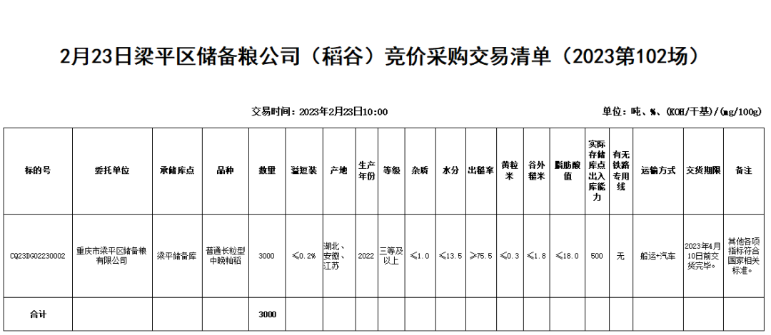 受重庆市梁平区储备粮有限公司委托,重庆市粮油批发市场有限责任公司(即国家粮食重庆交易中心,以下简称“批发市场”)定于2023年2月23日10:00举办梁平区储备粮公司(稻谷)竞价采购交易会,现将有关事项公告如下:2. 产地、年限及数量:湖北、安徽、江苏2022年产普通长粒型中晚籼稻3000吨。4. 交货地点:重庆市梁平区储备粮有限公司梁平储备库。5. 质量要求:一是符合国家粮食质量三等及以上质量标准,其中:出糙率≥75.5%;黄粒米≤0.3%;水分≤13.5%(水分13.6%-14.0%之间的超0.1%扣0.12%,超过14.0%拒收);杂质≤1.0%(杂质超标由买方整理达标后入库,整理损耗由卖方承担);谷外糙米≤1.8%;品种互混率≤3.0%。二是符合稻谷储存品质判定规则(GB/T20569-2006)宜存标准,其中脂肪酸值≤18.0mgKOH/100g。三是符合食品安全标准食品中真菌毒素限量(GB2761-2017)指标。四是符合国家卫生标准食品中污染物限量(GB2762-2017)指标。五是符合食品安全国家标准食品中农药最大残留限量(GB2763-2021)指标。六是其他各项指标必须符合国家相关标准,无虫蛀,无异味,无活虫。七是严禁掺杂以前年度陈粮。八是卖方交货时,必须向买方提供本批次粮食一个月以内的由有资质的检验机构出具的质量检验报告。6. 数量、质量验收:数量以重庆市梁平区储备粮有限公司梁平储备库地磅数量为准;要求溢短装≤0.2%。质量以到库综合扦样检验为准。粮食到达交货地点后,买方(或买方指定的存储库点企业)进行初检,初检结果仅作为是否入库的初步判断依据,不作为验收时是否合格的依据。对初检合格的粮食方能入库,对初检不合格的粮食可拒收。标的粮食入库完毕后,整仓质量经重庆市发改委指定的粮油质量监督检验站对粮食质量进行检验,该检验结果作为买方验收依据7. 本次交易清单附后。具体交易品种和数量等信息如有变化,以即时公告及交易清单为准。1. 报名资格:国内具有粮油生产、经营资格的企业且在国家粮食电子交易平台注册的有效会员。2. 报名时间:2023年2月23日8:00前。报名参与交易即视作全面承认并遵守《重庆市地方政府储备竞价采购交易规则》和交易公告、交易清单等要求。1. 本次竞价交易使用国家粮食交易平台地储交易系统,2023年2月23日10:00通过网络对委托标的依次按交易节进行交易。请报名参加竞价交易的会员按时登录国家粮食交易中心官网(www.grainmarket.com.cn)→点击网页上方“请登录”或右方“用户中心”进行会员登录→点击“交易”板块→选择“重庆市场”→“2月23日梁平区储备粮公司(稻谷)竞价采购交易专场”。1. 保证金的收取和释放:参与竞价交易的买卖双方须交纳保证金210元/吨(其中:履约保证金200元/吨和交易保证金10元/吨)。卖方保证金须在竞价采购交易会开始前2个小时汇至批发市场指定银行账户;买方保证金须在提交委托交易清单当日汇至批发市场指定银行账户。单笔合同交割完毕后,保证金释放。如合同部分交割,该合同数量的所有保证金处于冻结状态。2. 保证金转入:汇款时请备注“保证金”,待资金到账后,进入系统“用户中心”的资金界面,点击用户名称下方的“交易账户:明细”,将足额保证金“转入”重庆市场。3. 交易手续费:按成交金额的2.0‰向卖方收取。1. 成交价格:到达重庆市梁平区储备粮有限公司梁平储备库仓前交货价。2. 合同签订:自成交之日起3个工作日内买卖双方在交易系统内签订电子购销合同或以邮寄、扫描等方式签订,如逾期未签订购销合同,则对违约方作违约处理。3. 入库及付款:卖方须在2023年4月10日前交货完毕。买方须于成交之日起按进度将货款一次或分批汇入批发市场指定银行账户。当货物到达重庆市梁平区储备粮有限公司梁平储备库后,由重庆市梁平区储备粮有限公司检验人员检斤验质。4. 结算:粮食初检合格入库后,双方按入库数量1000吨分批签订《验收确认单》,批发市场按《验收确认单》数量在3个工作日内支付卖方80%货款。合同执行完毕并经重庆市发改委指定的粮油质量监督检验站对粮食质量进行检验合格后以及收到卖方发票后,买卖双方再次签订《验收确认单》,批发市场在3个工作日内按《验收确认单》将剩余货款拨付给卖方。2. 开户银行:中国农业银行股份有限公司重庆九龙坡中梁山支行 3. 账 号:31-0707010400088881. 本场交易规则详见“重庆粮网”(www.grainmarket.com.cn/centerweb/region/CQ)、“重庆粮食集团”官网(www.cqgrain.com)《重庆市地方政府储备竞价采购交易规则》,与此规则不一致的以本次公告为准。2. 会员成交后到委托方指定交货地点交货时,需遵守当地的疫情防控政策,做好疫情防控工作。3. 各会员单位发现以陈顶新、转圈粮、套取财政补贴、人为设置障碍造成入库难等违法违规问题的,请拨打12325举报。4. 市场交易部联系电话:023-65269777 023-65269283 ▶ 网站 | www.grainmarket.com.cn/centerweb/region/CQ