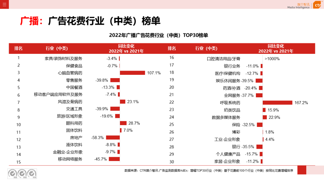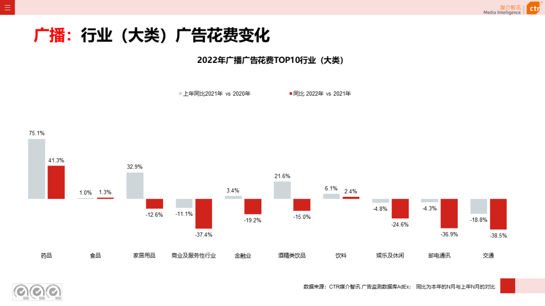 2022年广播广告头部行业中,药品行业广告增投最为抢眼,同比上涨41.3%,食品和饮料行业广告花费同比也分别上涨1.3%和2.4%;商业及服务性行业、邮电通讯和交通行业的广播广告同比下跌均超过35%。