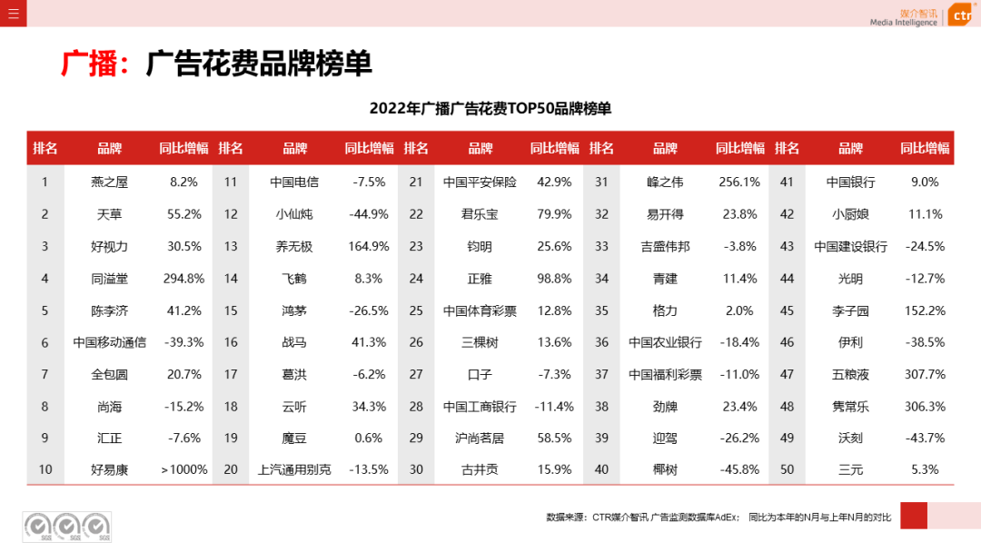 从行业中类的投放表现看,口腔清洁用品/牙膏品类在广播渠道增投抢眼,投放品牌主要有好易康、南京同仁堂、双极水、BOP、WO等,其中后四个品牌均是2022年才试水广播广告。此外,除了上述提及的食品和饮料行业部分品类广告减投明显外,家具/装饰材料及服务、零售服务、中国餐酒三个广播广告头部品类的广告花费同比分别呈现3.4%、39.8%和13.3%的跌幅。