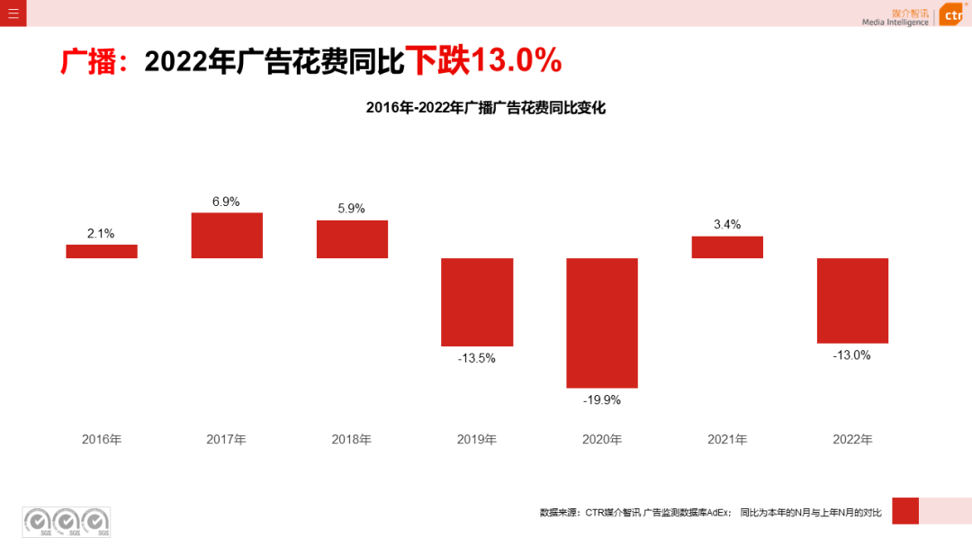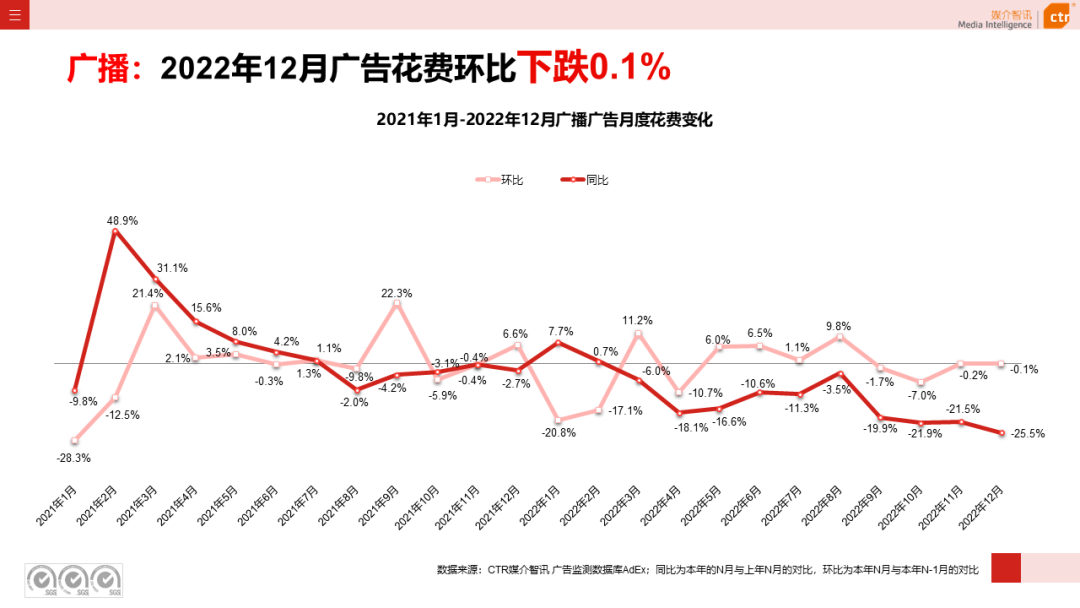根据CTR媒介智讯的数据显示,2022年广播广告刊例花费同比下跌13.0%。从月度投放观察,广播广告各月环比变化起伏不断,在5-8月连续呈现略有波动的正增长态势之后,持续环比下跌,截止12月广播广告环比下跌0.1%。