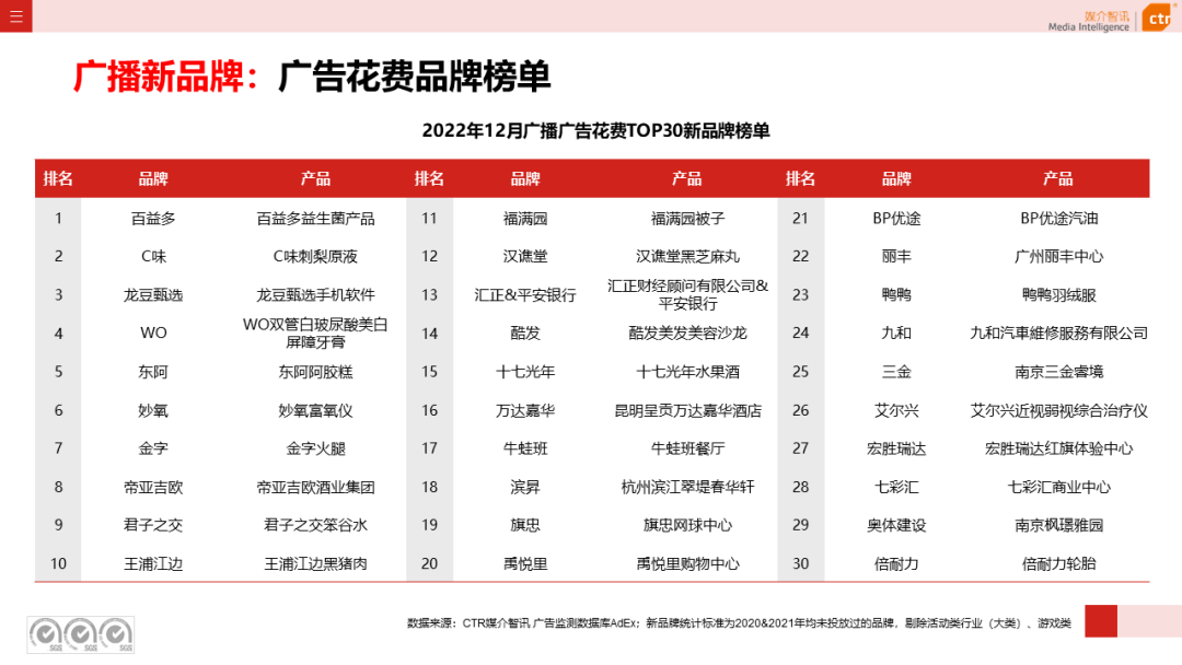 新品牌方面,12月广播广告新品牌前三十榜单里,超四成品牌来自食品、房地产/建筑工程行业、商业及服务性行业,其余品牌覆盖娱乐及休闲、交通、饮料等10个行业。