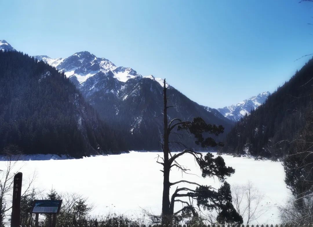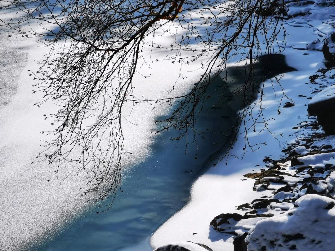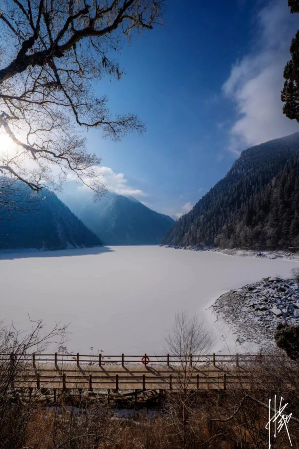 阳光跨过山谷,越过森林,寻着一抹透亮的白而去。金光笼罩着整片山谷,连雪色的长海也被衬托得愈发端庄娴静,幽蓝深邃的海子被薄冰掩盖,光线在这里无限反射,像一条条金丝线装饰着这里,而那圆润的光晕挂在线上闪烁着绚丽的光彩,两岸山峦被照得通亮,温暖在这里满溢,制作出一杯醇厚的茶,提神醒脑,让人活力无限。