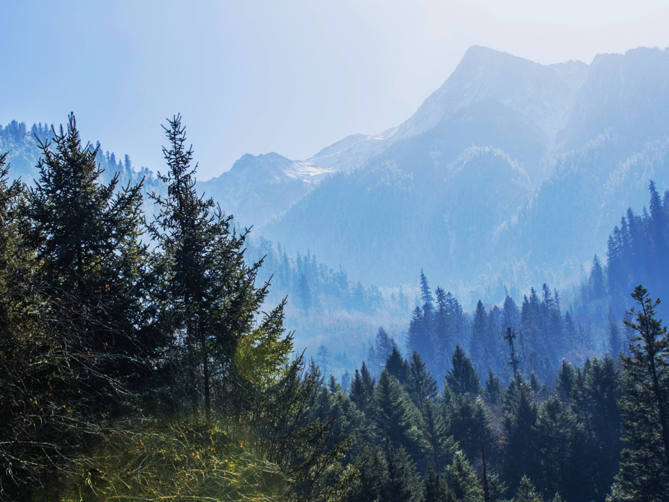 连绵起伏的山峦上云层高低相连,飞鸟在云雾中时隐时现,伴随着几声高亢的鸟鸣,崭新而美好的一天浮现在眼前。穿透过山林形成的点点滴滴阳光,若隐若现,像金蝶扑闪着翅膀在青松间飞舞徘徊,当你伸出双手便能承接住一缕阳光,温暖而充满了活力,让人情不自禁想将心绪拿出来晒一晒,像久违的老友一般,与大自然谈起那些尘封往事。