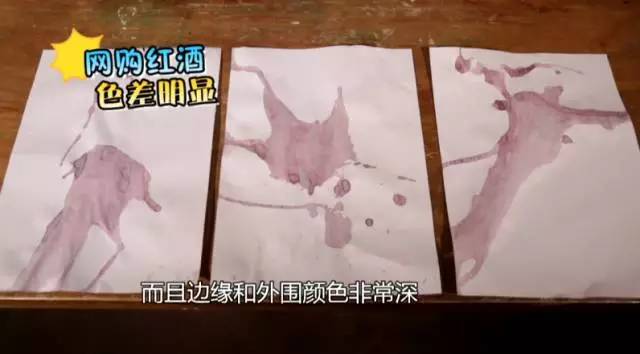 网上还有一种辨别假酒的方法,就是把它们倒在洁白的A4纸上面,如果说红酒是真的话,颜色会非常均匀,如果说是勾兑出来的色素红酒,颜色就非常不均,作为对比,我们委托试酒师买了正宗红酒作为参照。