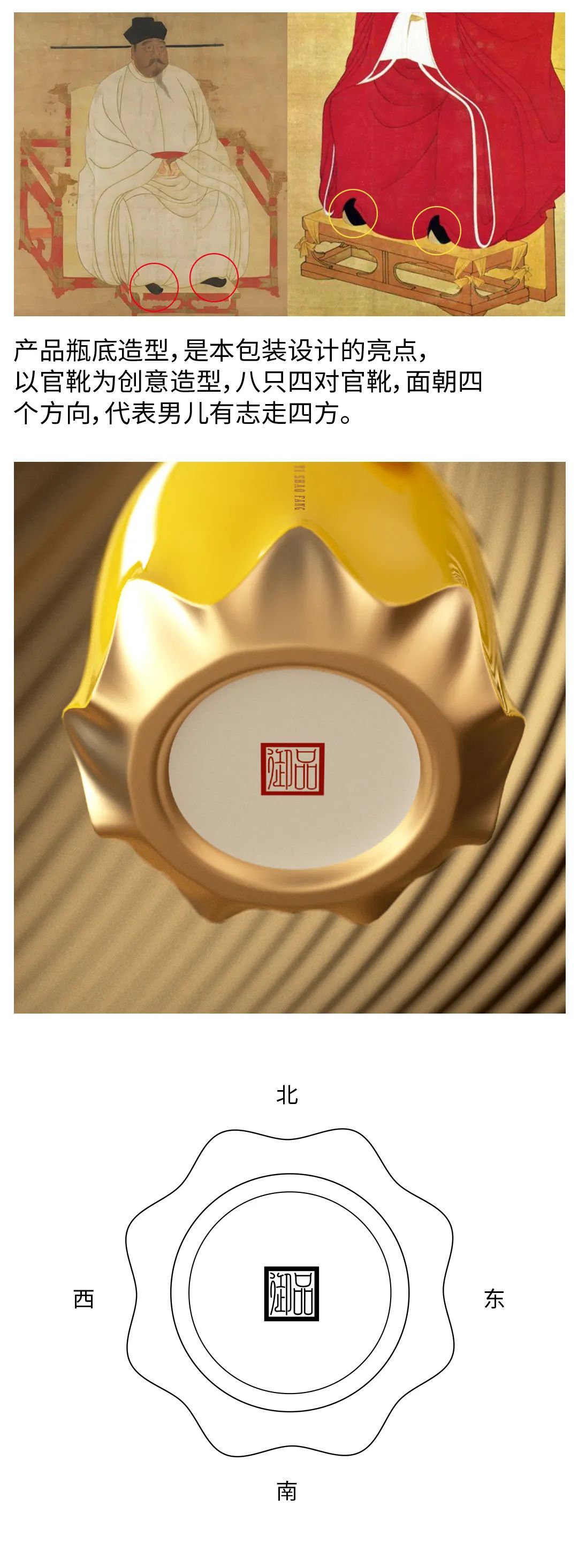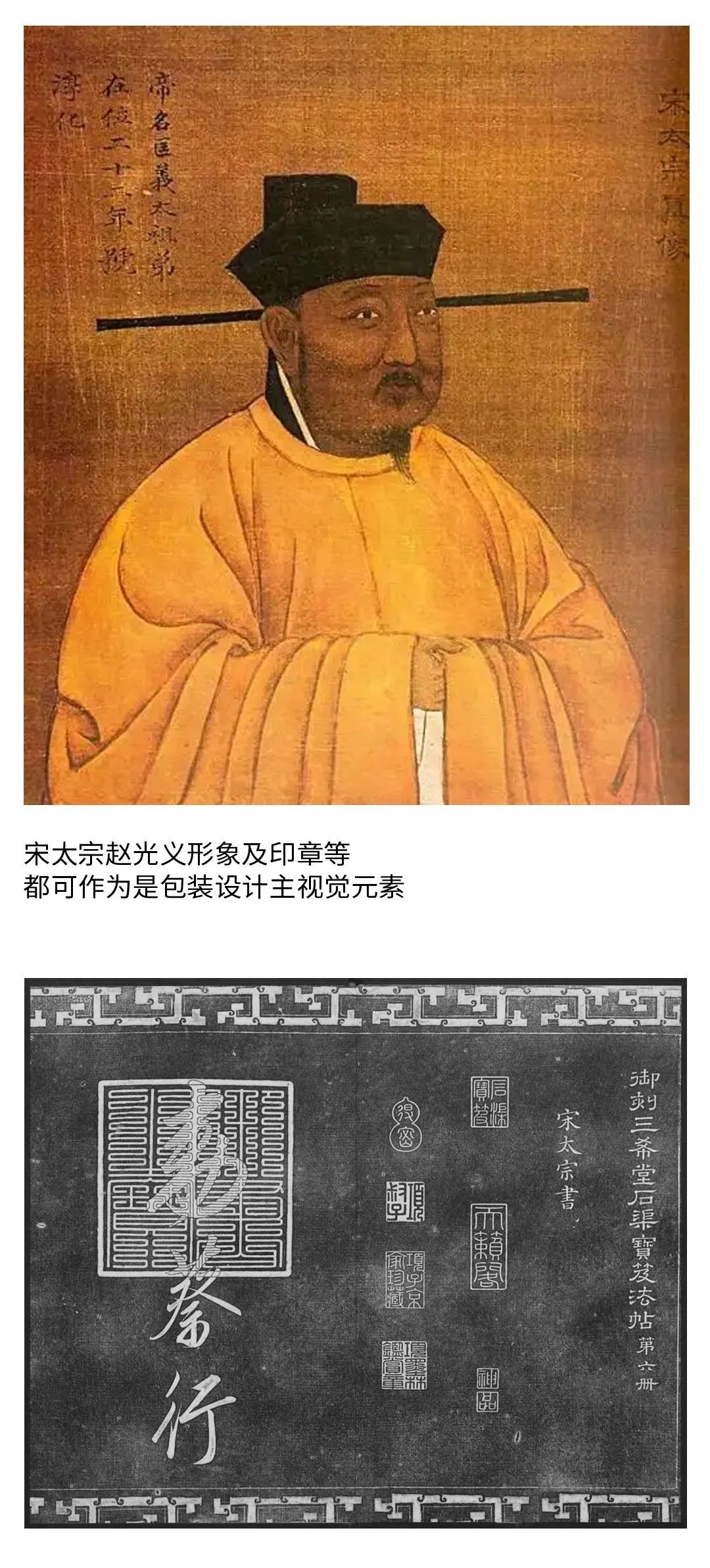 古代帝王黄袍加身,九五之尊,宋太祖时期以简为美,包括皇帝龙袍都很少有龙的纹样。在产品包装设计上,博创用线描形式表现赵光义形象,尽量简化线条,整体平色,形成类似剪影效果,简中蕴含非凡大气。