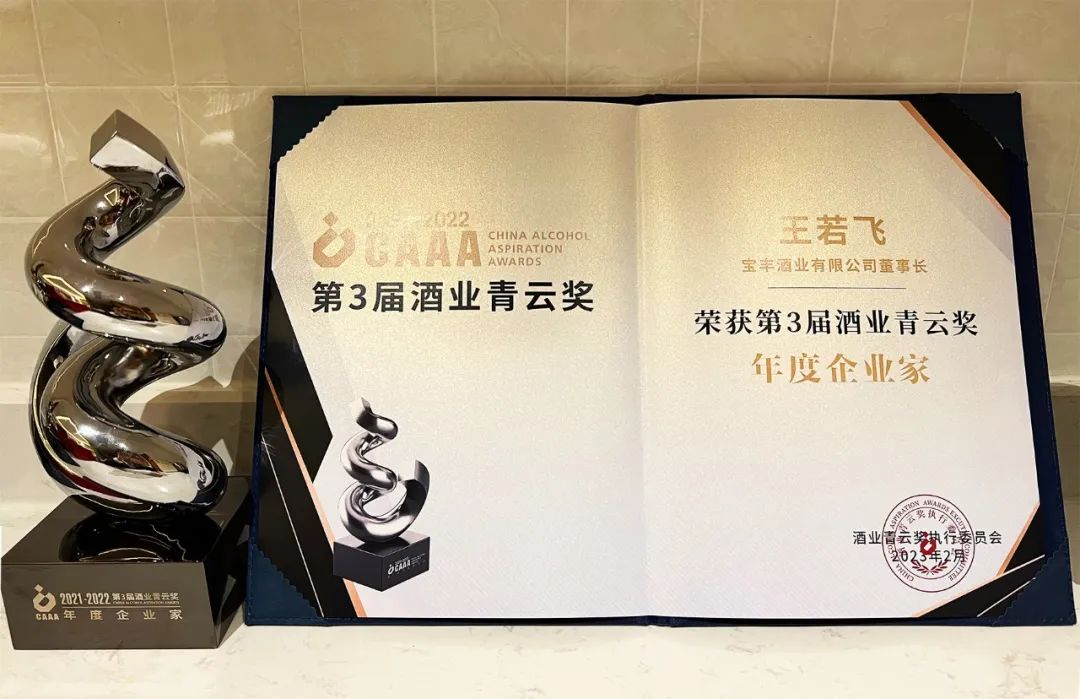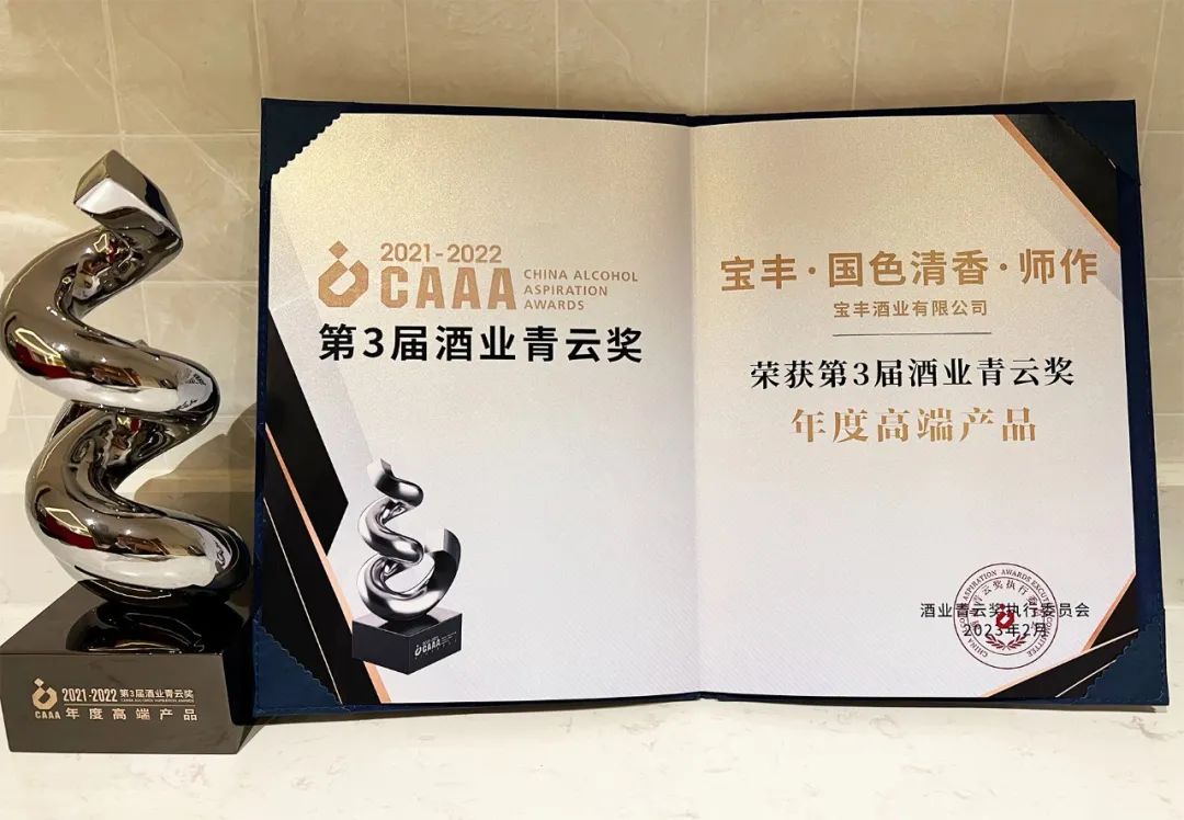 第3届酒业青云奖颁奖典礼上,宝丰·国色清香师作荣获第3届酒业青云奖“年度高端产品”奖项,宝丰酒业董事长王若飞荣获第3届酒业青云奖“年度企业家”奖项,为宝丰酒业大满贯荣誉库再添新。