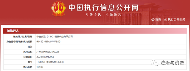 据中国执行信息公开网消息,2月20日,中食安泓(广东)健康产业有限公司(简称:中食安泓)因未按时履行法律义务,被广东省广州市天河区人民法院强制执行18985元。所属案号为(2023)粤0106执4496号。
