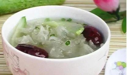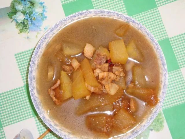 冬瓜:50克、面粉:50克、精肉:15克、山芹:30克、猪肚:10克、黄瓜:20克