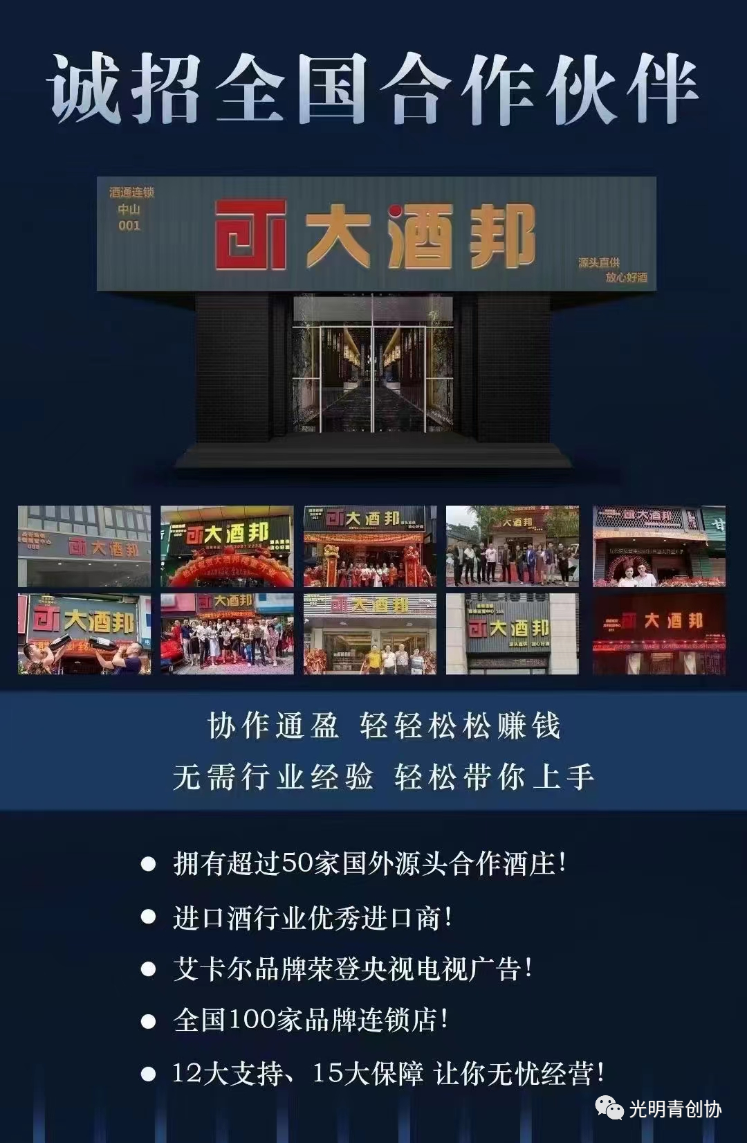 大酒邦品牌连锁隶属酒通集团,总部位于广东省深圳市光明区,集团母公司酒通天下成立于2013年10月。是一家以进口酒类和贸易为主、集连锁店销售管理、进出口清关、专业葡萄酒培训一体的集团性供应链酒商。公司专注于酒类行业,秉承"源头直供放心好酒"的经营理念,致力于打造可靠优质的酒类连锁加盟平台。集团拥有3家全资子公司,超过50家国外源头合作酒庄,全国100家品牌连锁店,3000个国内经销网点。市场覆盖全国30多个省、自治区和直辖市。酒通集团作为进口红酒领跑者,已然成为葡萄酒文化的普及者和葡萄酒市场的规范者。