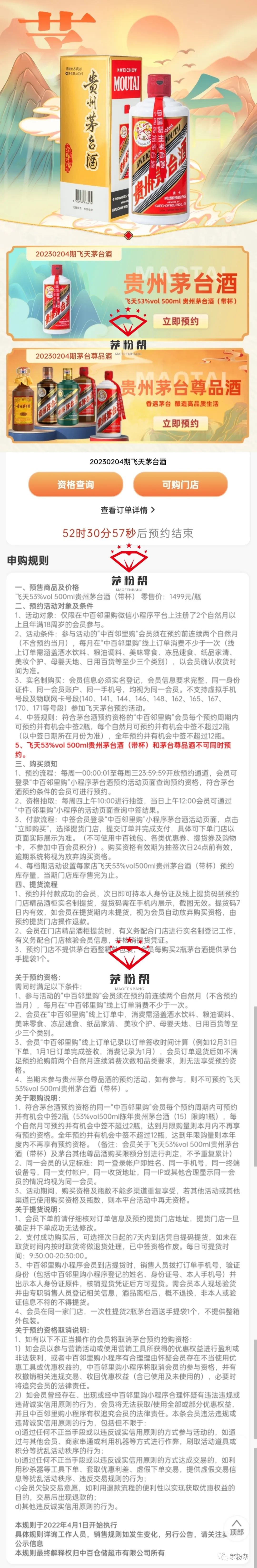 ​茅台预约丨商超2月第4期茅台预约,全年12瓶!!