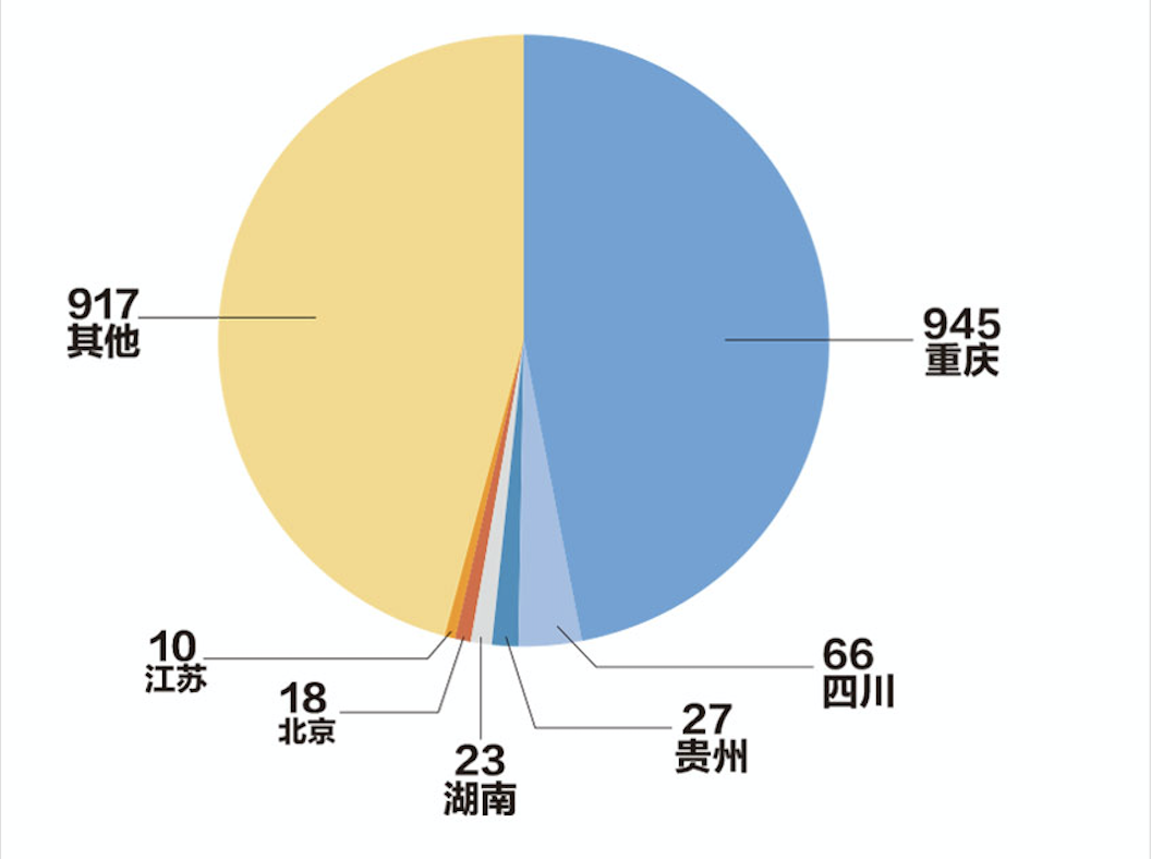 此外,在检出的不合格产品中,接近一半的不合格产品来自重庆,一共有946批次,占到总批次的47.1%。除了重庆之外,四川和贵州也检测出了不合格的白酒。