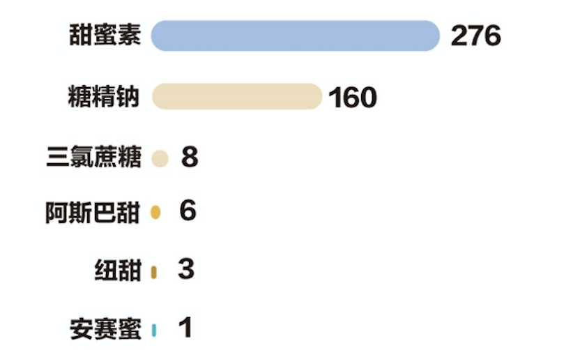 除了固形物超标的问题外,甜味剂超标则是另一个大问题,有近22%的产品违规添加了甜味剂。